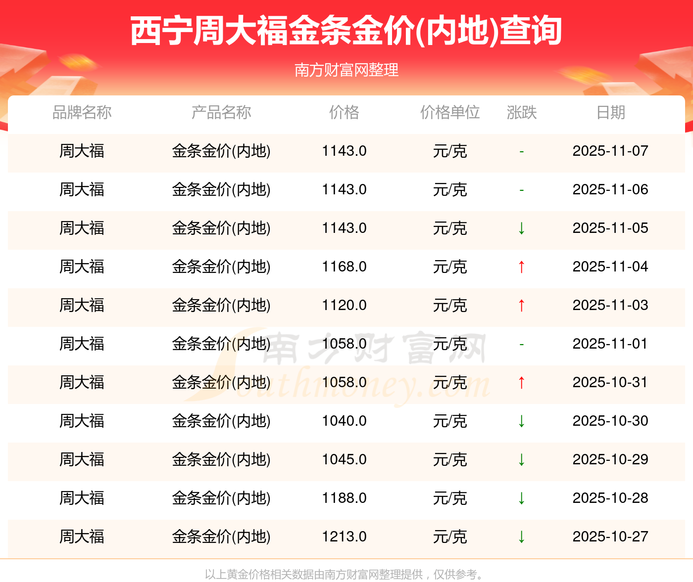 2025年11月9日,寶泉錢幣、金蘭首飾、金蘭首飾、謝瑞麟、謝瑞麟、謝瑞麟、謝瑞麟、謝瑞麟、金銀街、金銀街、金銀街等各大金店品牌金條金價(內(nèi)地)今日價格如下:寶泉錢幣11.4元/克、金蘭首飾1263.0元/克、金蘭首飾560.0元/克、謝瑞麟1202.0元/克、謝瑞麟1268.0元/克、謝瑞麟44260.0、謝瑞麟13080.0、謝瑞麟39960.0、金銀街1243.0元/克、金銀街1258.0元/克、金銀街1248.0元/克。