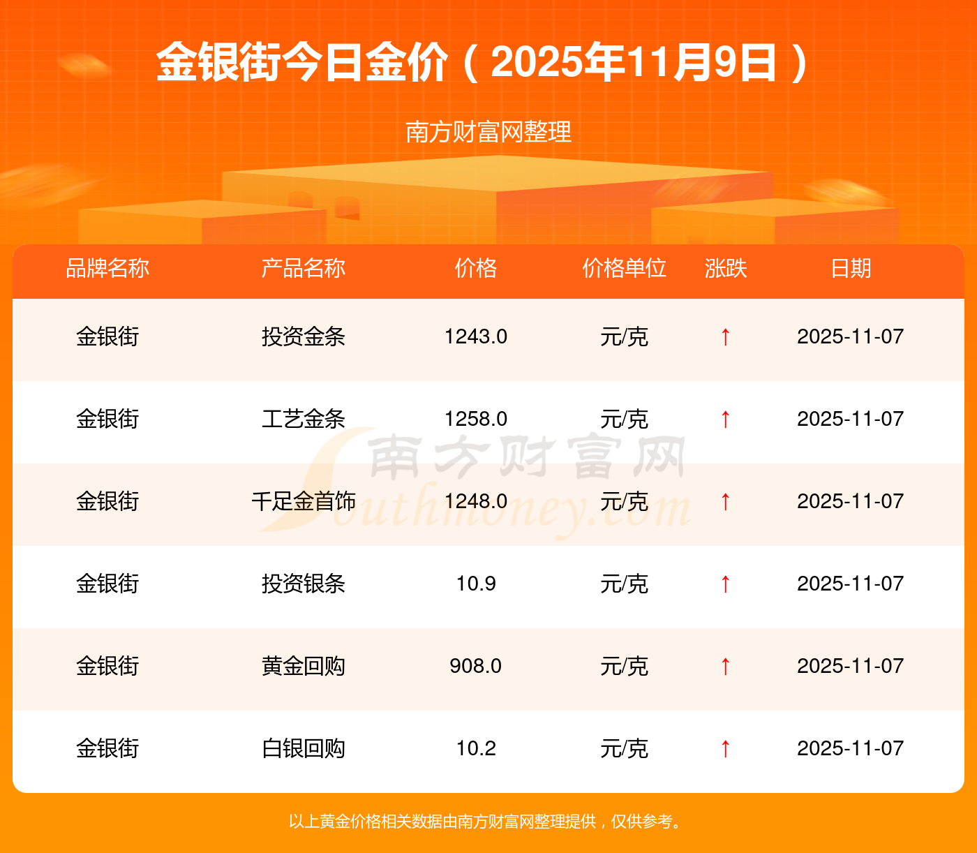 銀條價(jià)格11.4元/克,黃金價(jià)格1263.0元/克,鉑金價(jià)格560.0元/克,金條價(jià)格(內(nèi)地)1202.0元/克,金飾價(jià)格(內(nèi)地)1268.0元/克,黃金飾品(香港)44260.0,鉑金飾品(香港)13080.0,金條金價(jià)(香港)39960.0,投資金條1243.0元/克,工藝金條1258.0元/克,千足金首飾1248.0元/克。