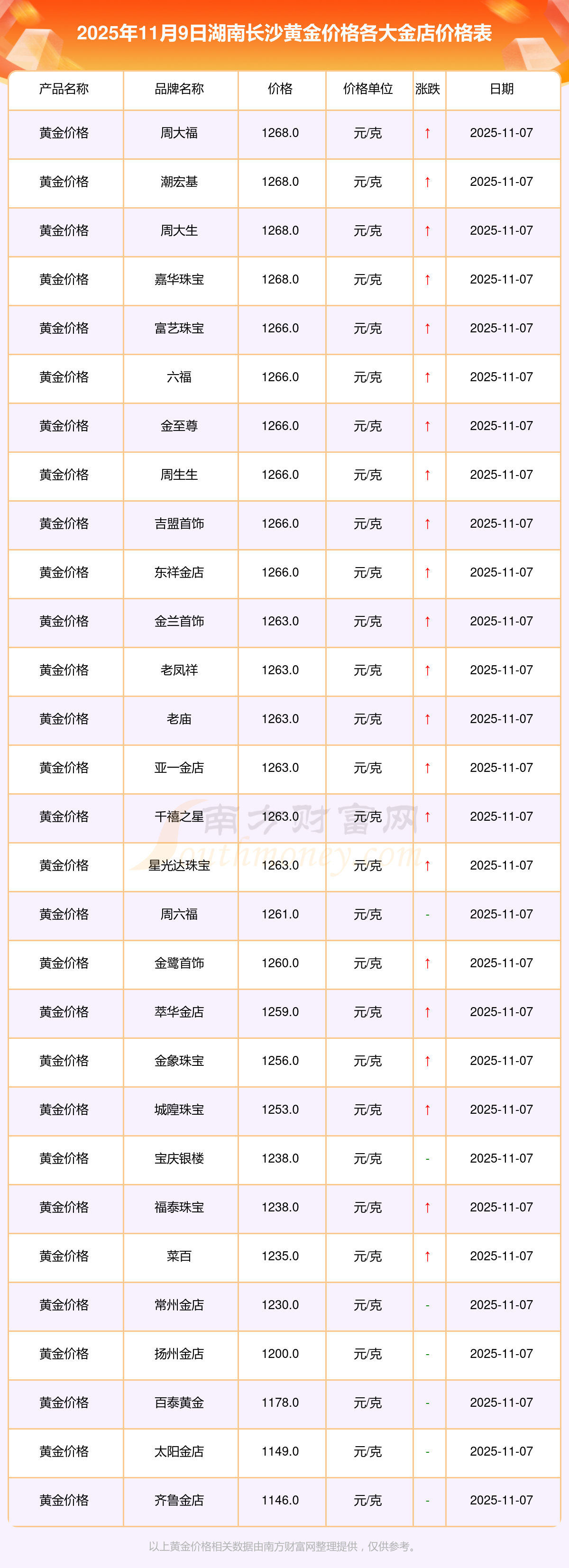 今天是2025年11月9日,湖南長(zhǎng)沙寶泉錢幣、金蘭首飾、金蘭首飾、謝瑞麟、謝瑞麟、謝瑞麟、謝瑞麟、謝瑞麟、金銀街、金銀街、金銀街等各大金店品牌黃金價(jià)格最新價(jià)格行情是這樣的:寶泉錢幣11.4元/克、金蘭首飾1263.0元/克、金蘭首飾560.0元/克、謝瑞麟1202.0元/克、謝瑞麟1268.0元/克、謝瑞麟44260.0、謝瑞麟13080.0、謝瑞麟39960.0、金銀街1243.0元/克、金銀街1258.0元/克、金銀街1248.0元/克。