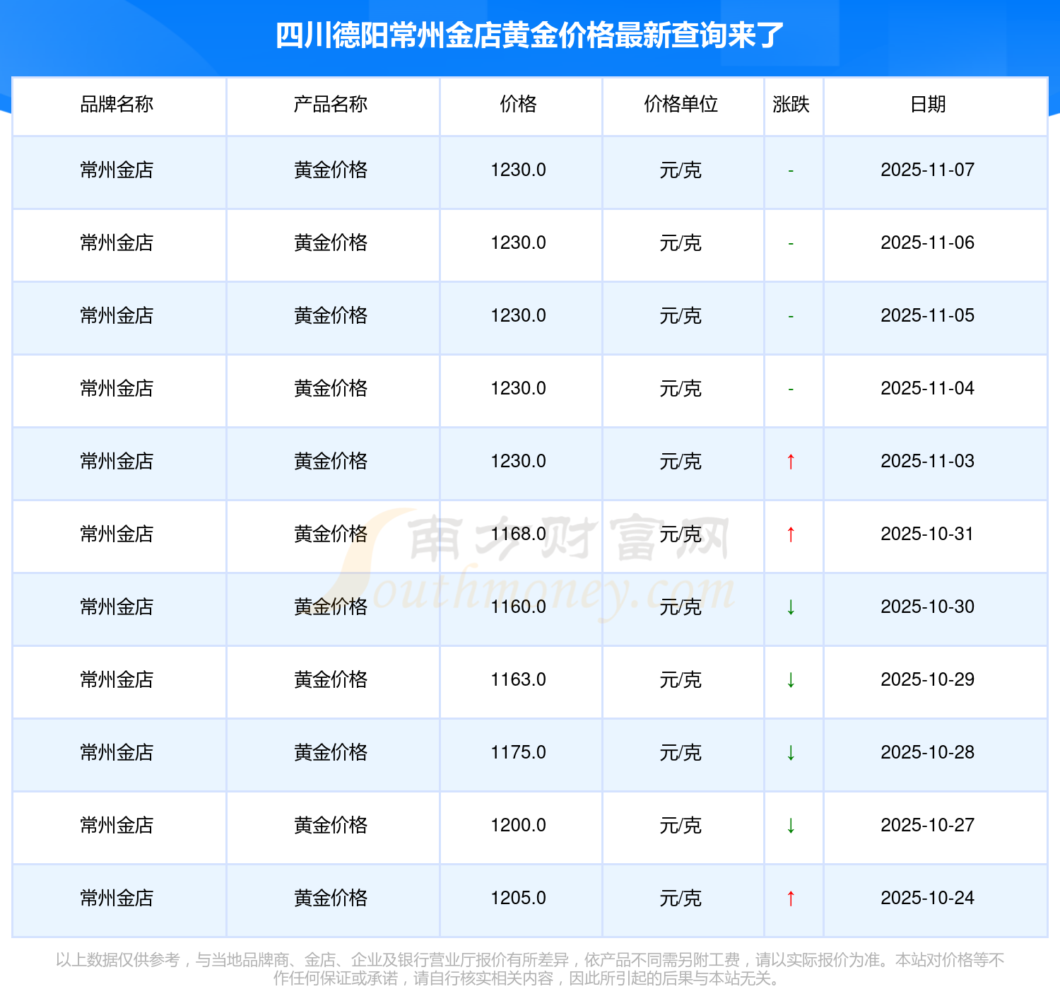 2025年11月9日,四川德陽(yáng)常州金店所售黃金價(jià)格,其價(jià)格設(shè)定為 1230.0元/克。