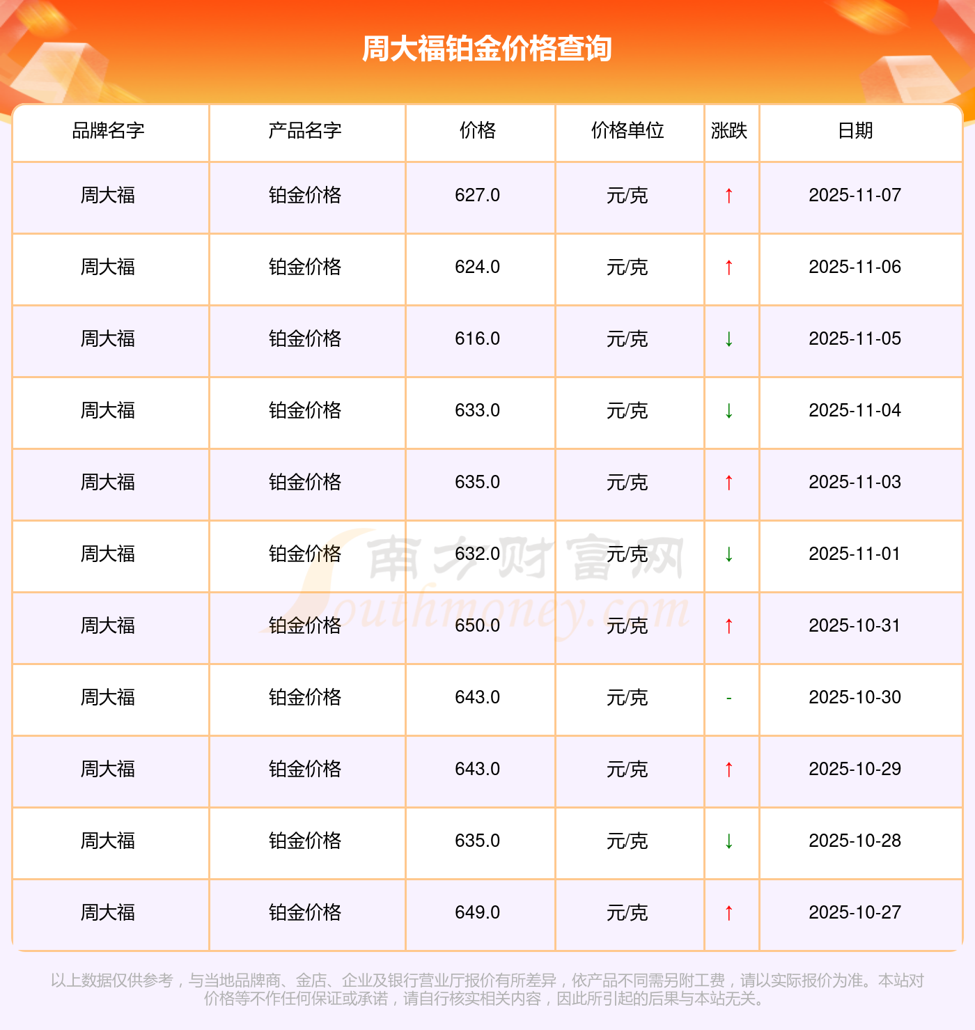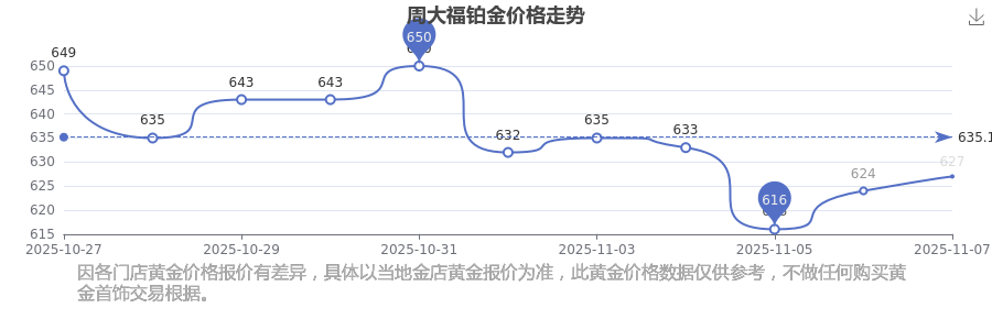 今日周大福 鉑金價格的最新定價為627.0元/克。