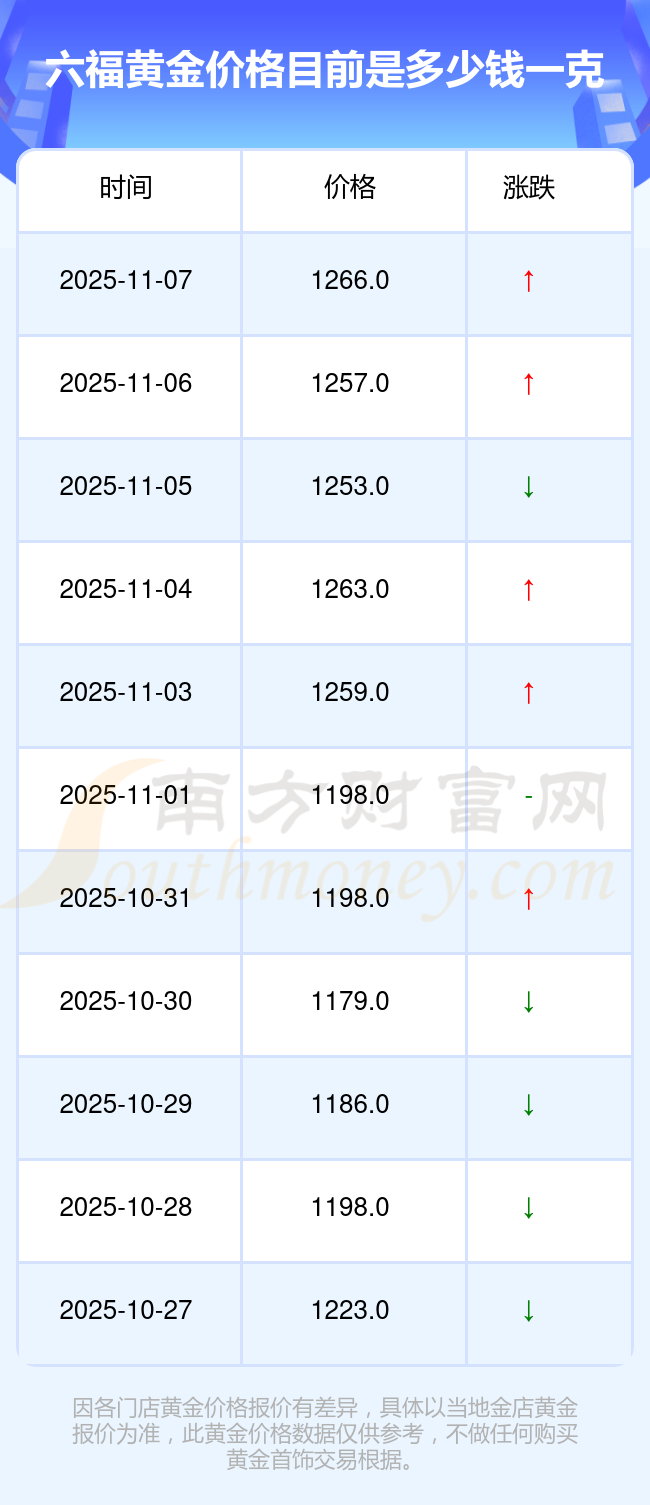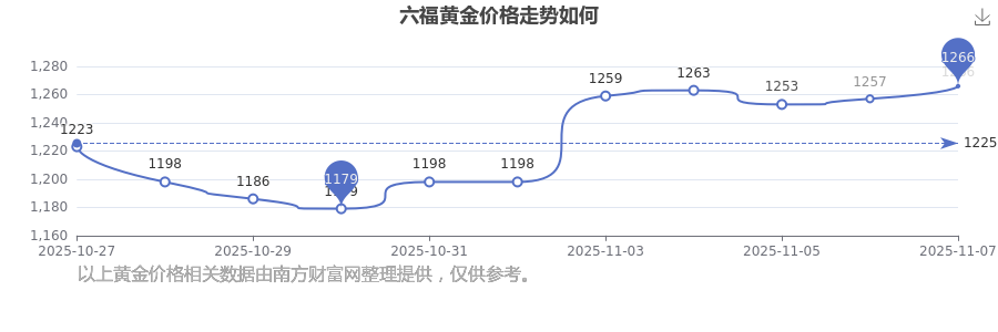 今日(2025年11月9日),六福黃金價(jià)格:1266.0元/克。