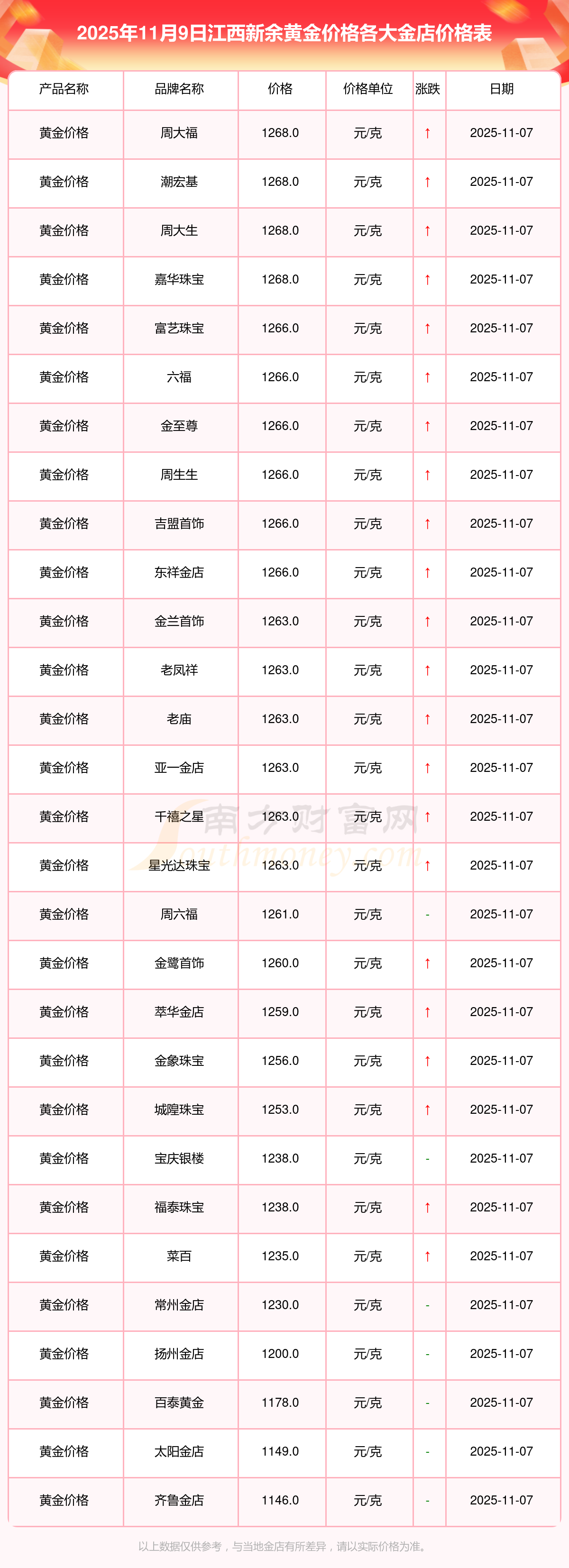 2025年11月9日,江西新余寶泉錢幣、金蘭首飾、金蘭首飾、謝瑞麟、謝瑞麟、謝瑞麟、謝瑞麟、謝瑞麟、金銀街、金銀街、金銀街等各大金店品牌黃金價(jià)格今日價(jià)格行情最新來了:寶泉錢幣11.4元/克、金蘭首飾1263.0元/克、金蘭首飾560.0元/克、謝瑞麟1202.0元/克、謝瑞麟1268.0元/克、謝瑞麟44260.0、謝瑞麟13080.0、謝瑞麟39960.0、金銀街1243.0元/克、金銀街1258.0元/克、金銀街1248.0元/克。