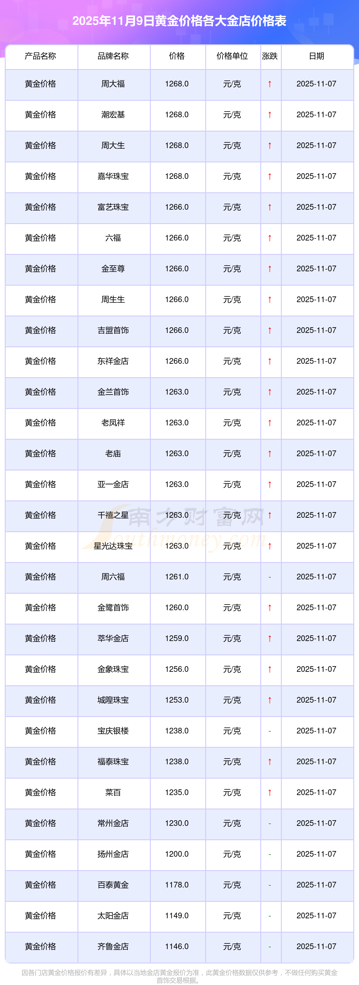2025年11月9日寶泉錢幣、金蘭首飾、金蘭首飾、謝瑞麟、謝瑞麟、謝瑞麟、謝瑞麟、謝瑞麟、金銀街、金銀街、金銀街等各大金店品牌黃金價格最新價格如下:寶泉錢幣銀條價格11.4元/克,金蘭首飾黃金價格1263.0元/克,金蘭首飾鉑金價格560.0元/克,謝瑞麟金條價格(內地)1202.0元/克,謝瑞麟金飾價格(內地)1268.0元/克,謝瑞麟黃金飾品(香港)44260.0,謝瑞麟鉑金飾品(香港)13080.0,謝瑞麟金條金價(香港)39960.0,金銀街投資金條1243.0元/克,金銀街工藝金條1258.0元/克,金銀街千足金首飾1248.0元/克。