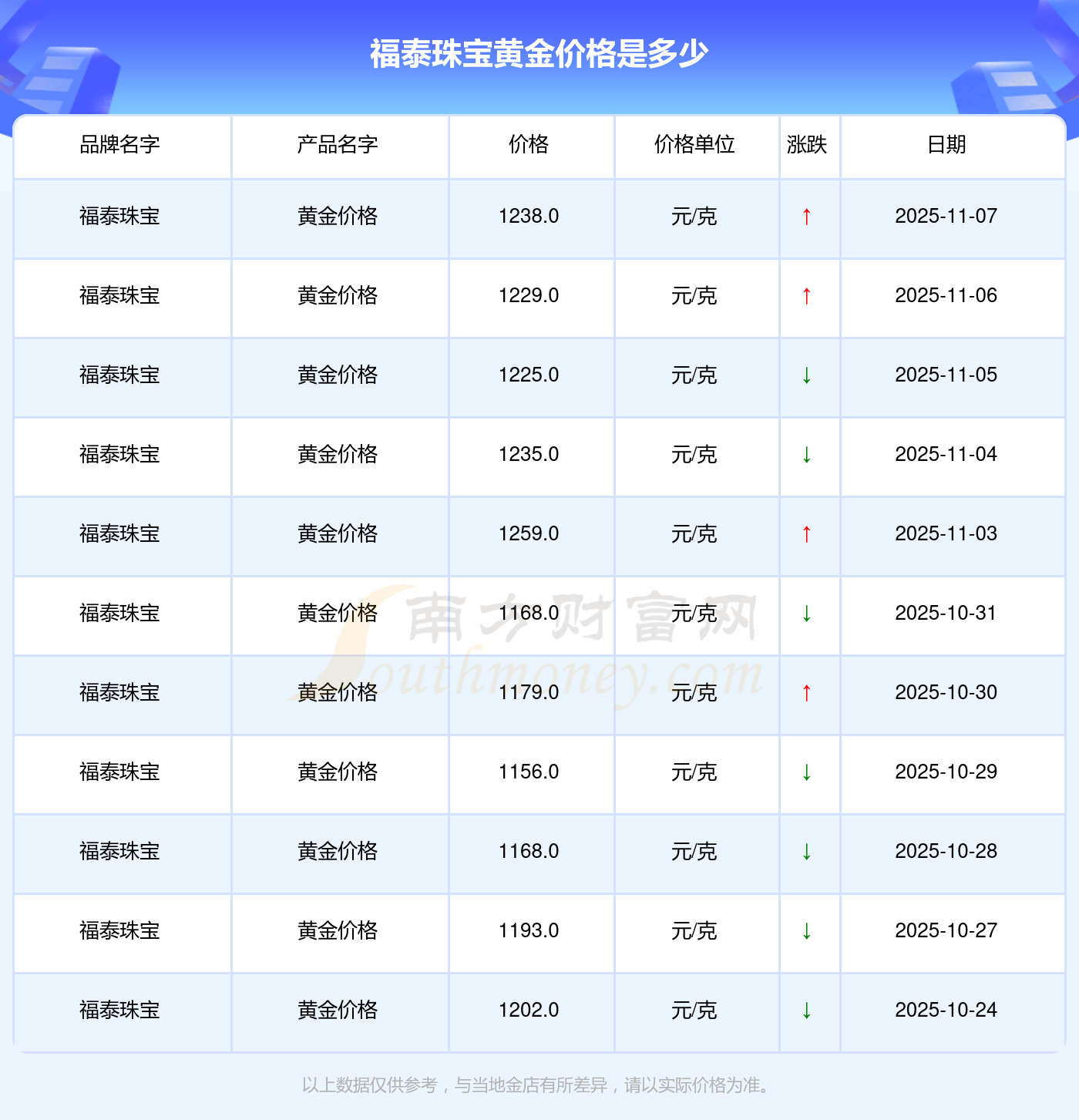 2025年11月9日福泰珠寶黃金價格:1238.0元/克。