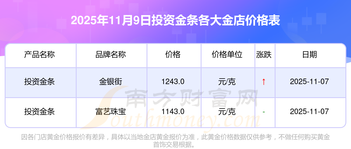 2025年11月9日各大金店投資金條最新價格:寶泉錢幣11.4元/克,金蘭首飾1263.0元/克,金蘭首飾560.0元/克,謝瑞麟1202.0元/克,謝瑞麟1268.0元/克,謝瑞麟44260.0,謝瑞麟13080.0,謝瑞麟39960.0,金銀街1243.0元/克,金銀街1258.0元/克,金銀街1248.0元/克。