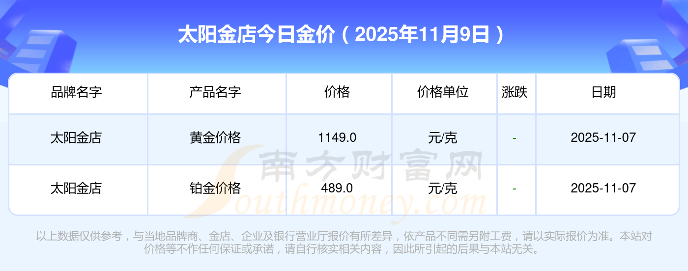 2025年11月9日太陽(yáng)金店金價(jià)查詢:銀條價(jià)格11.4元/克,黃金價(jià)格1263.0元/克,鉑金價(jià)格560.0元/克,金條價(jià)格(內(nèi)地)1202.0元/克,金飾價(jià)格(內(nèi)地)1268.0元/克,黃金飾品(香港)44260.0,鉑金飾品(香港)13080.0,金條金價(jià)(香港)39960.0,投資金條1243.0元/克,工藝金條1258.0元/克,千足金首飾1248.0元/克。