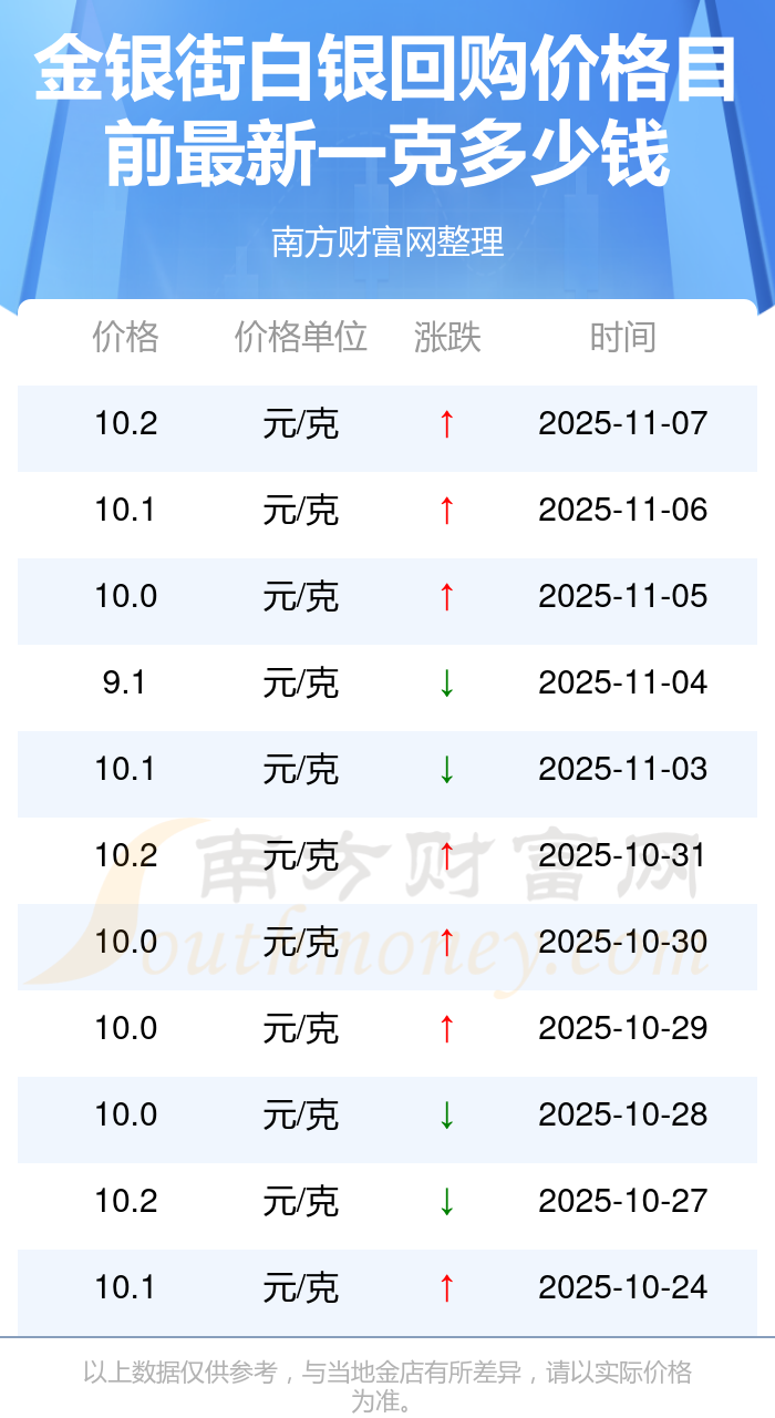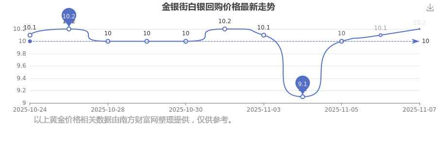 金銀街 白銀回購(gòu)價(jià)格在今日更新至10.2元/克。