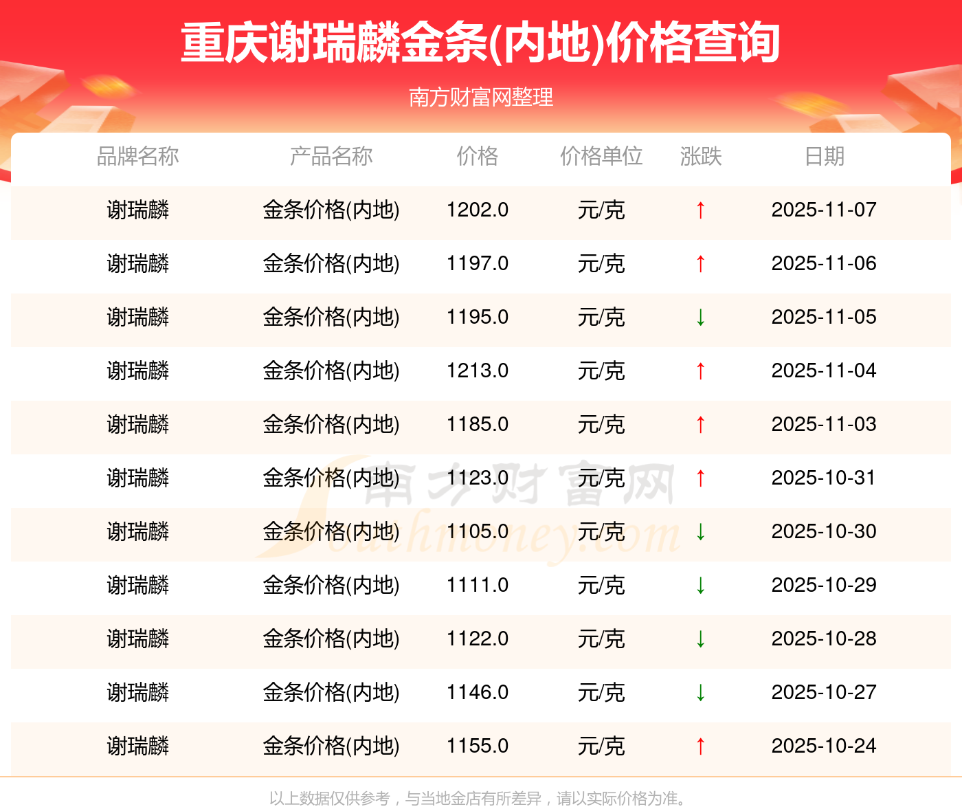 2025年11月9日,重慶謝瑞麟金條價格(內(nèi)地)每克的價值量定格在1202.0元/克。