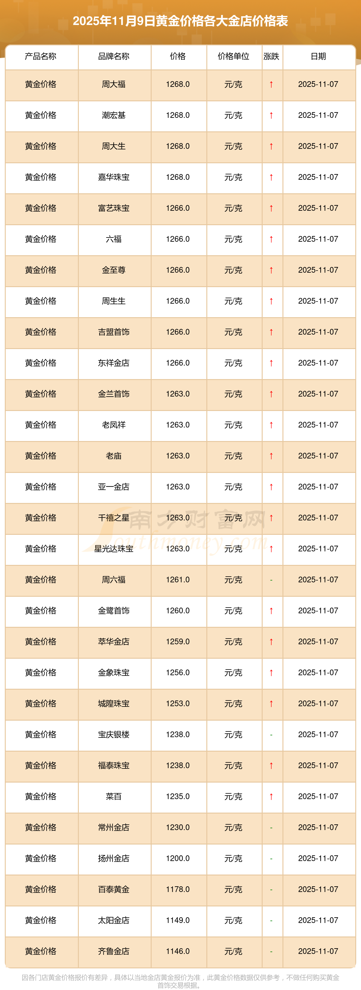 今天是2025年11月9日,寶泉錢幣、金蘭首飾、金蘭首飾、謝瑞麟、謝瑞麟、謝瑞麟、謝瑞麟、謝瑞麟、金銀街、金銀街、金銀街等各大金店品牌黃金價格最新價格如下:寶泉錢幣11.4元/克、金蘭首飾1263.0元/克、金蘭首飾560.0元/克、謝瑞麟1202.0元/克、謝瑞麟1268.0元/克、謝瑞麟44260.0、謝瑞麟13080.0、謝瑞麟39960.0、金銀街1243.0元/克、金銀街1258.0元/克、金銀街1248.0元/克。