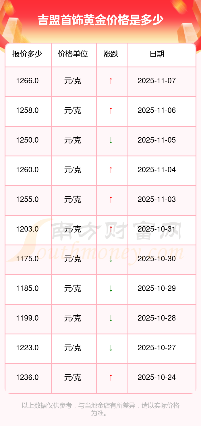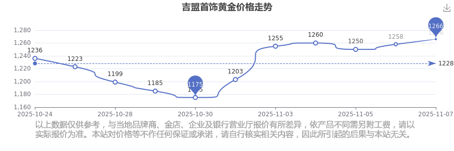 今日(2025年11月9日),吉盟首飾黃金價(jià)格最新價(jià)格為1266.0元/克。