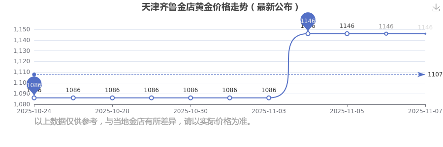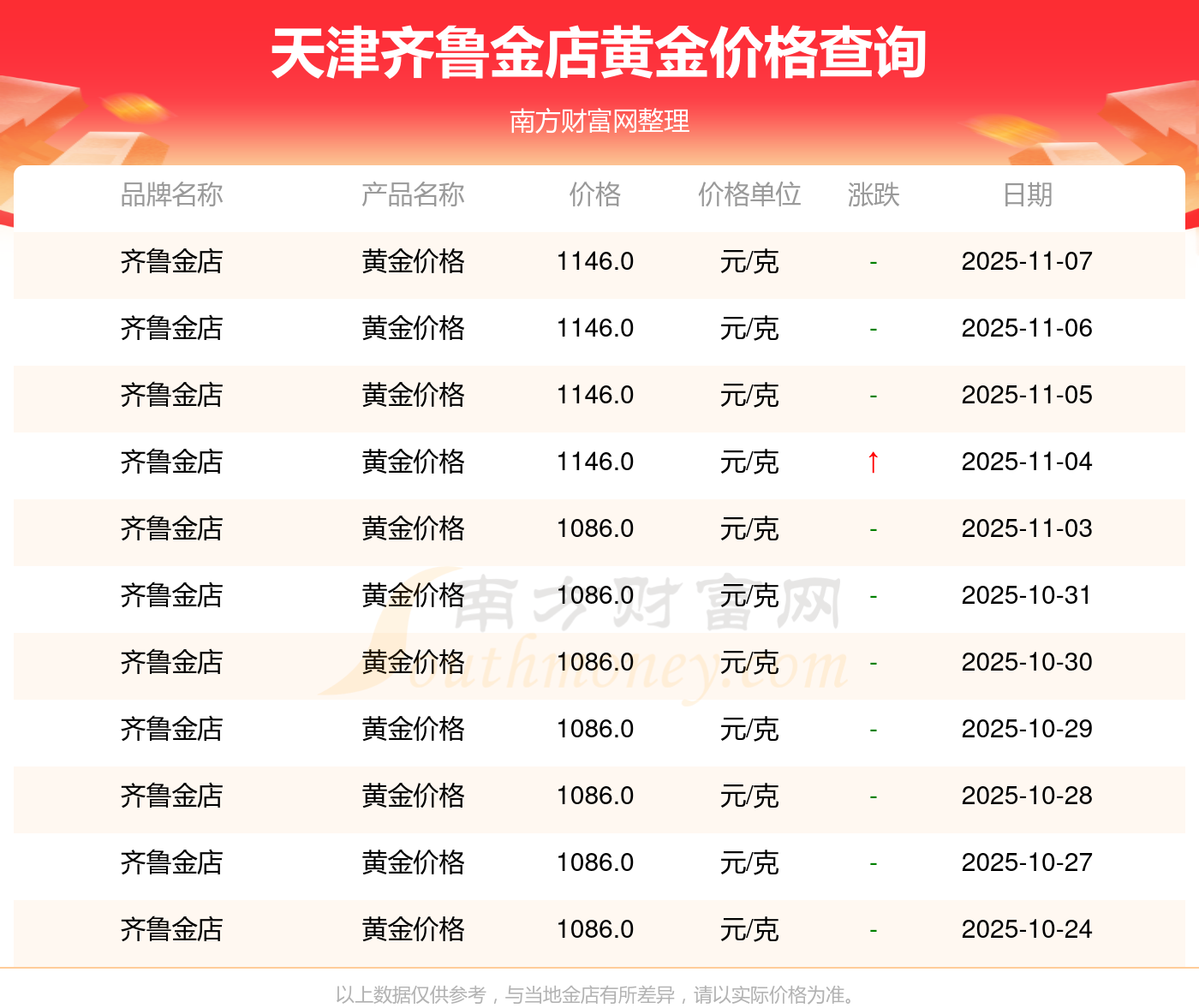 天津齊魯金店黃金價格在 2025年11月9日為 1146.0元/克。
