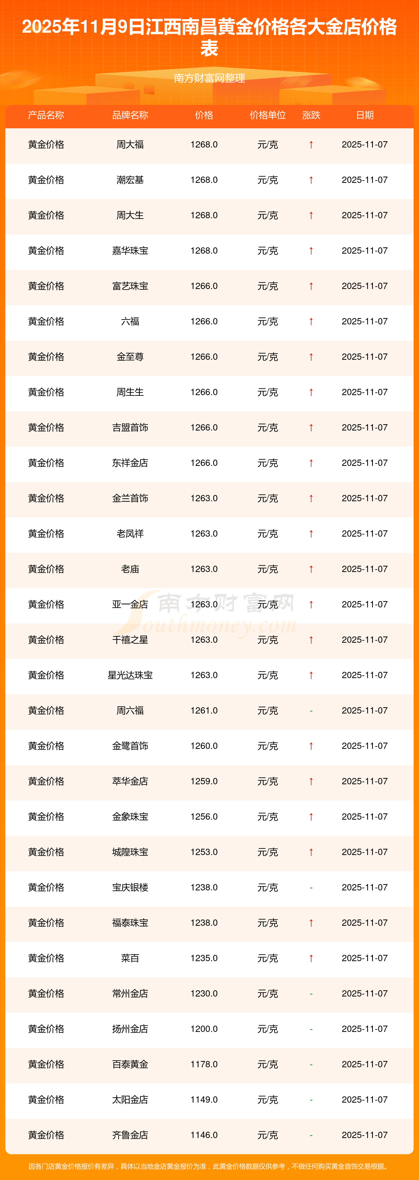 2025年11月9日江西南昌各大金店黃金價(jià)格最新價(jià)格查詢(xún)來(lái)了:寶泉錢(qián)幣11.4元/克,金蘭首飾1263.0元/克,金蘭首飾560.0元/克,謝瑞麟1202.0元/克,謝瑞麟1268.0元/克,謝瑞麟44260.0,謝瑞麟13080.0,謝瑞麟39960.0,金銀街1243.0元/克,金銀街1258.0元/克,金銀街1248.0元/克。