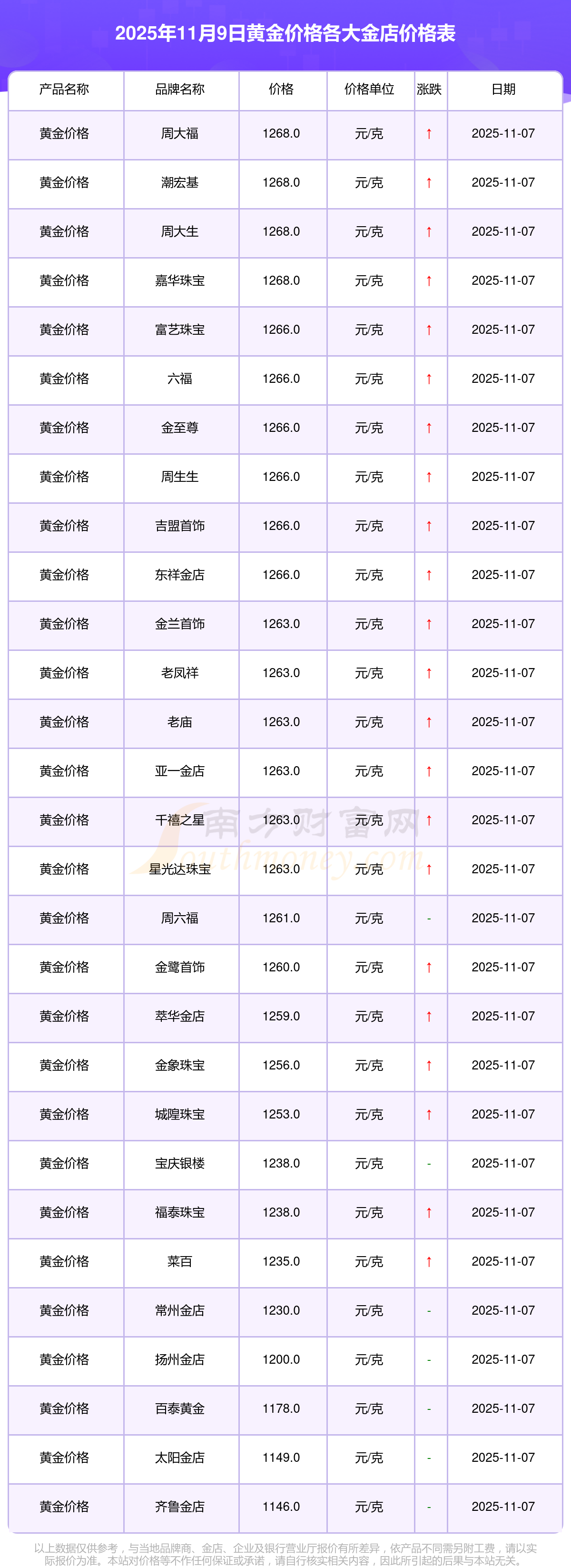 今天是2025年11月9日,寶泉錢幣、金蘭首飾、金蘭首飾、謝瑞麟、謝瑞麟、謝瑞麟、謝瑞麟、謝瑞麟、金銀街、金銀街、金銀街等各大金店品牌黃金價格最新價格如下:寶泉錢幣11.4元/克、金蘭首飾1263.0元/克、金蘭首飾560.0元/克、謝瑞麟1202.0元/克、謝瑞麟1268.0元/克、謝瑞麟44260.0、謝瑞麟13080.0、謝瑞麟39960.0、金銀街1243.0元/克、金銀街1258.0元/克、金銀街1248.0元/克。