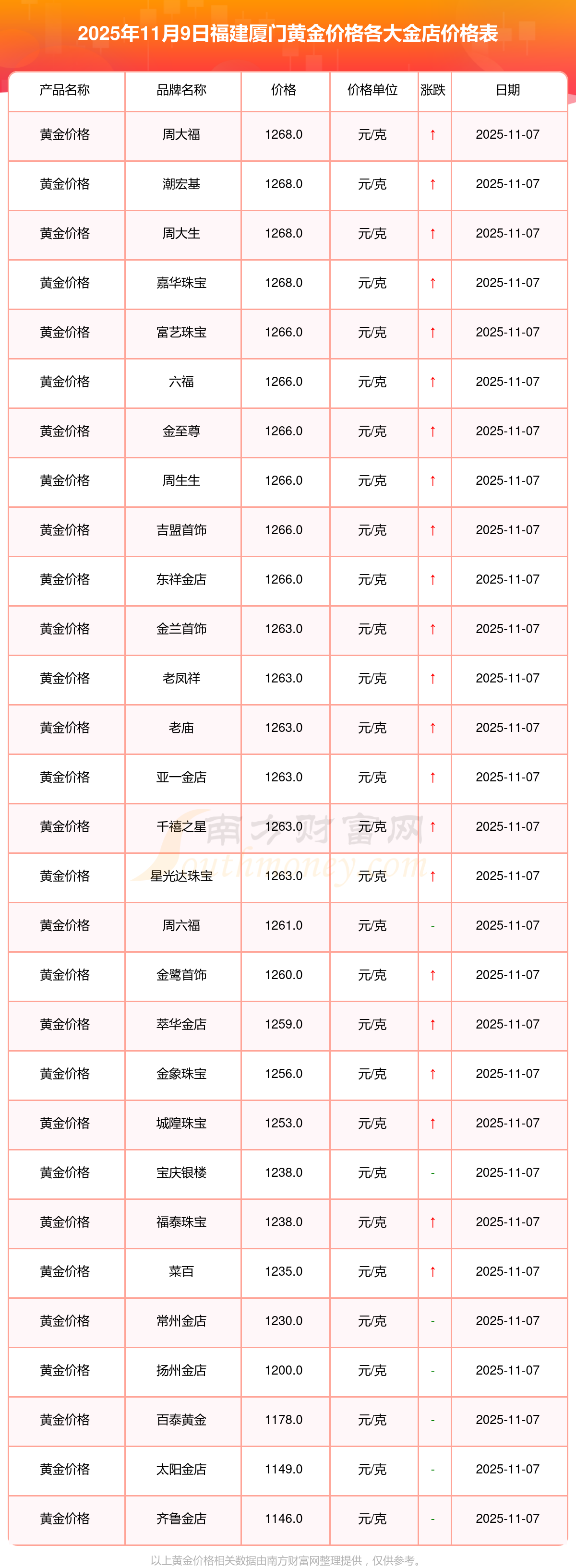 2025年11月9日福建廈門寶泉錢幣、金蘭首飾、金蘭首飾、謝瑞麟、謝瑞麟、謝瑞麟、謝瑞麟、謝瑞麟、金銀街、金銀街、金銀街等各大金店品牌黃金價格最新價格行情來了,如下:寶泉錢幣銀條價格11.4元/克,金蘭首飾黃金價格1263.0元/克,金蘭首飾鉑金價格560.0元/克,謝瑞麟金條價格(內(nèi)地)1202.0元/克,謝瑞麟金飾價格(內(nèi)地)1268.0元/克,謝瑞麟黃金飾品(香港)44260.0,謝瑞麟鉑金飾品(香港)13080.0,謝瑞麟金條金價(香港)39960.0,金銀街投資金條1243.0元/克,金銀街工藝金條1258.0元/克,金銀街千足金首飾1248.0元/克。