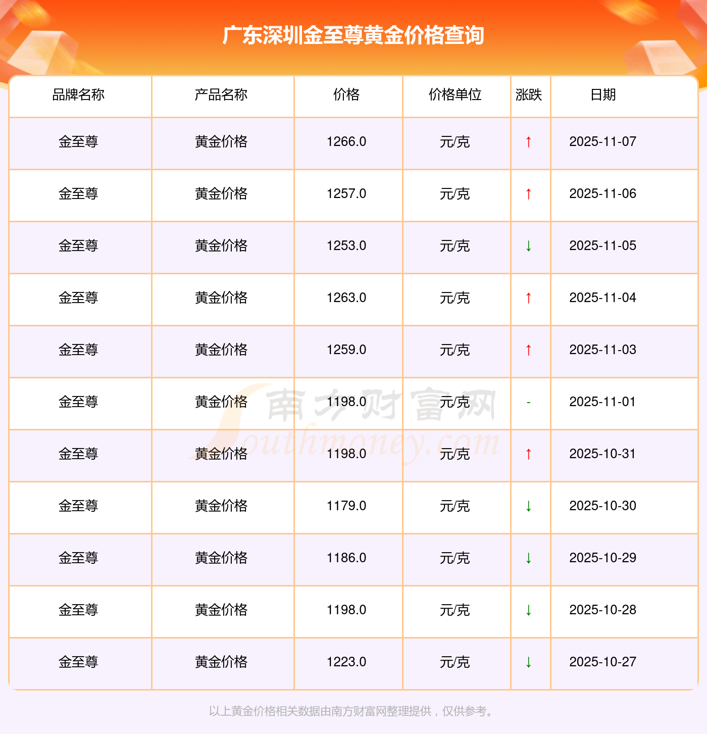 (2025年11月9日)廣東深圳金至尊黃金價格現(xiàn)在為1266.0元/克。