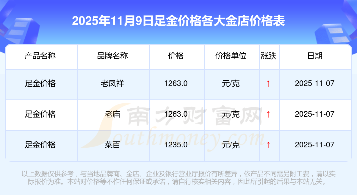 今天是2025年11月9日,寶泉錢幣、金蘭首飾、金蘭首飾、謝瑞麟、謝瑞麟、謝瑞麟、謝瑞麟、謝瑞麟、金銀街、金銀街、金銀街等各大金店品牌足金價格最新價格如下:寶泉錢幣11.4元/克、金蘭首飾1263.0元/克、金蘭首飾560.0元/克、謝瑞麟1202.0元/克、謝瑞麟1268.0元/克、謝瑞麟44260.0、謝瑞麟13080.0、謝瑞麟39960.0、金銀街1243.0元/克、金銀街1258.0元/克、金銀街1248.0元/克。