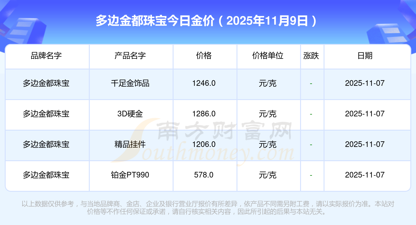 多邊金都珠寶黃金在今日的定價為多少?銀條價格11.4元/克,黃金價格1263.0元/克,鉑金價格560.0元/克,金條價格(內(nèi)地)1202.0元/克,金飾價格(內(nèi)地)1268.0元/克,黃金飾品(香港)44260.0,鉑金飾品(香港)13080.0,金條金價(香港)39960.0,投資金條1243.0元/克,工藝金條1258.0元/克,千足金首飾1248.0元/克。