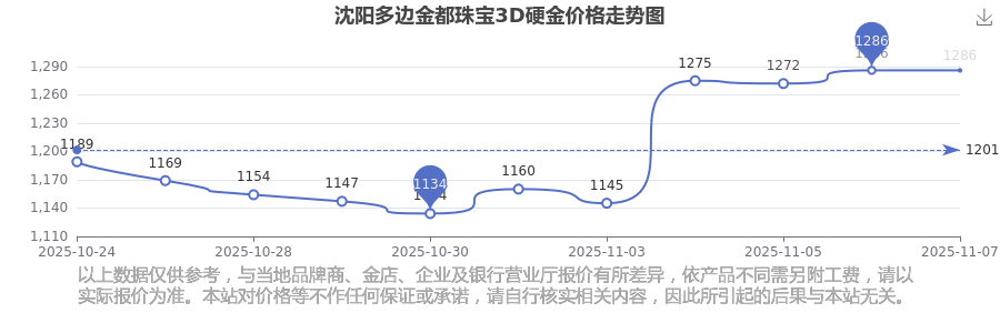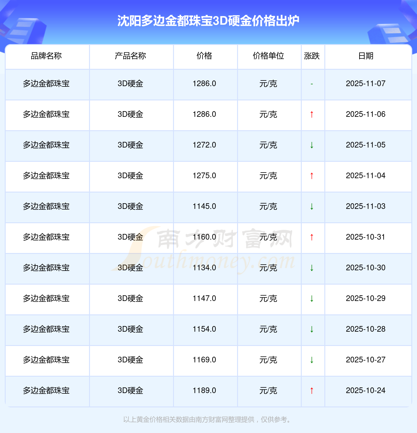 今日2025年11月9日,沈陽(yáng)多邊金都珠寶3D硬金價(jià)格為1286.0元/克。