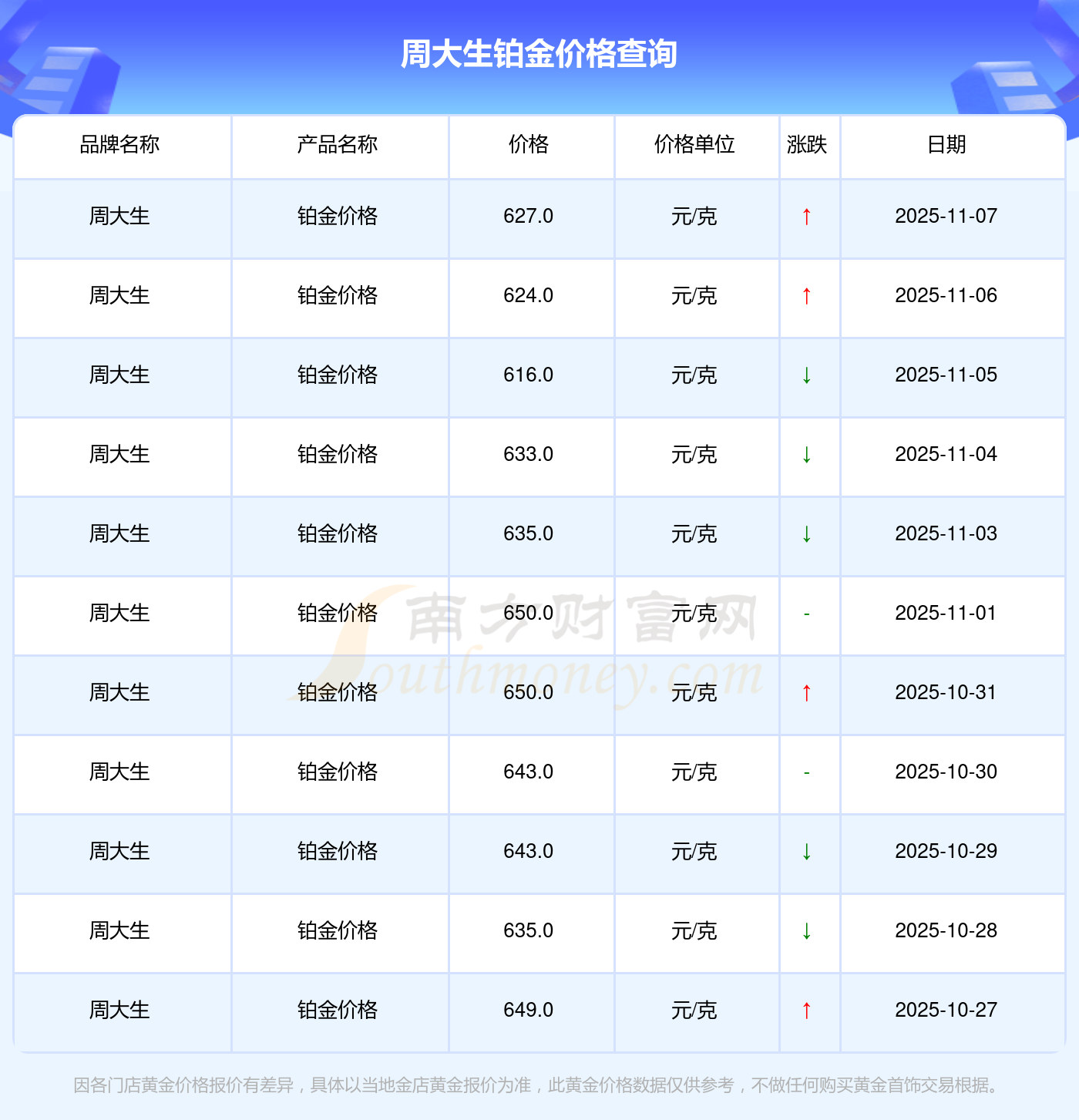 今日(2025年11月9日),周大生鉑金價(jià)格最新價(jià)格是627.0元/克。