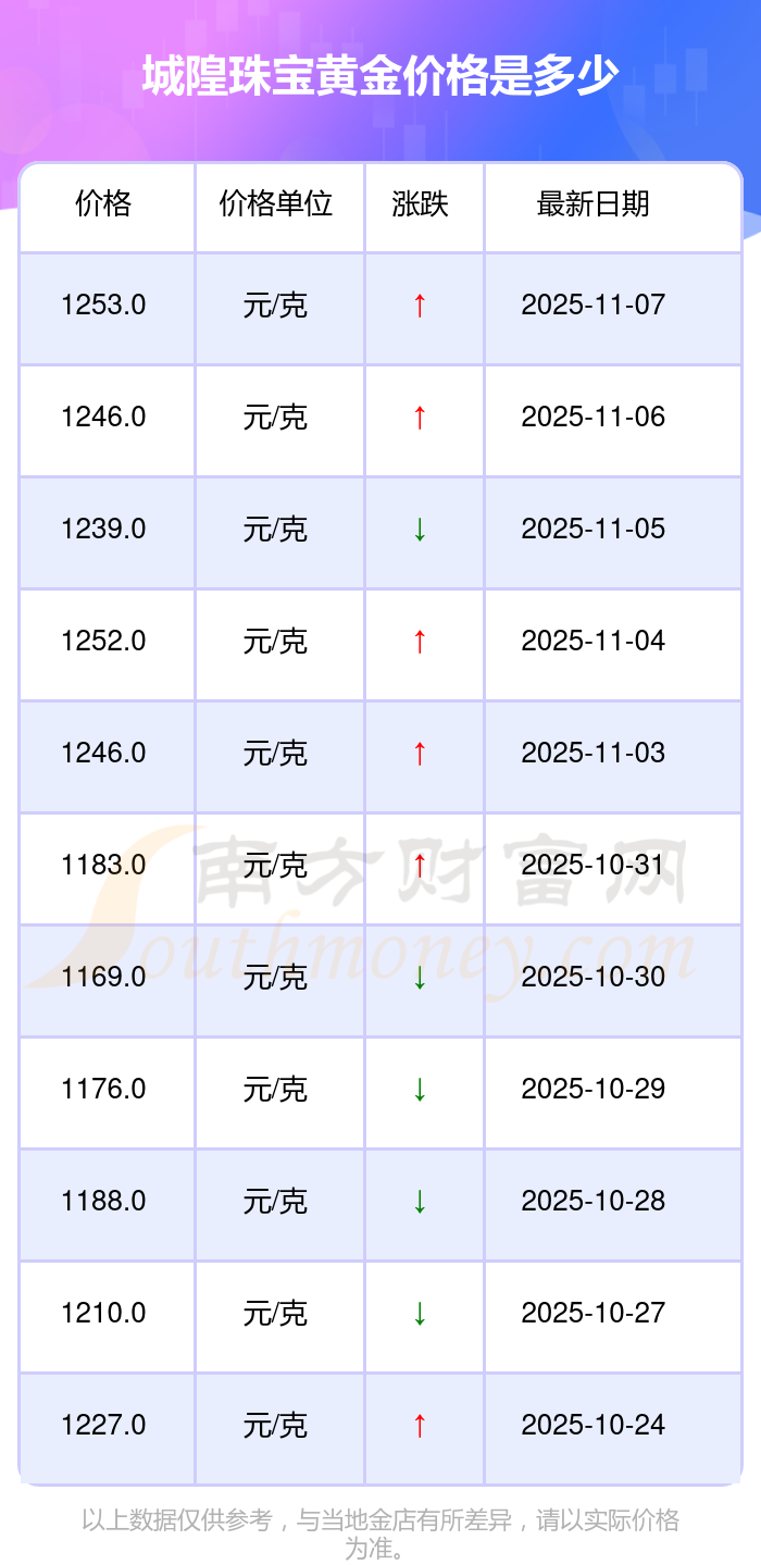 2025年11月9日城隍珠寶黃金價(jià)格為1253.0元/克。