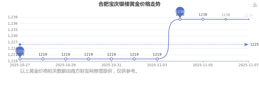 2025年11月9日,合肥寶慶銀樓黃金價(jià)格每克的售賣價(jià)位為1238.0元/克。