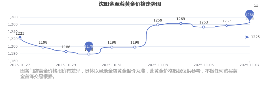 今天黃金每克能賣多少錢?今日沈陽金至尊黃金價格查詢,2025年11月9日,沈陽金至尊的黃金價格標(biāo)價達(dá)到 1266.0元/克。
