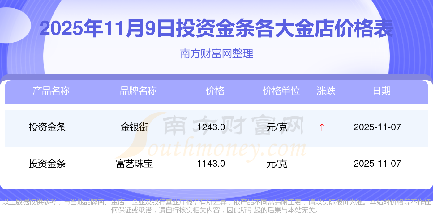 2025年11月9日各大金店投資金條最新價(jià)格:寶泉錢幣11.4元/克,金蘭首飾1263.0元/克,金蘭首飾560.0元/克,謝瑞麟1202.0元/克,謝瑞麟1268.0元/克,謝瑞麟44260.0,謝瑞麟13080.0,謝瑞麟39960.0,金銀街1243.0元/克,金銀街1258.0元/克,金銀街1248.0元/克。