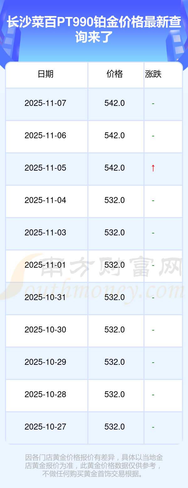 今日長沙菜百PT990鉑金的價格為542.0元/克。