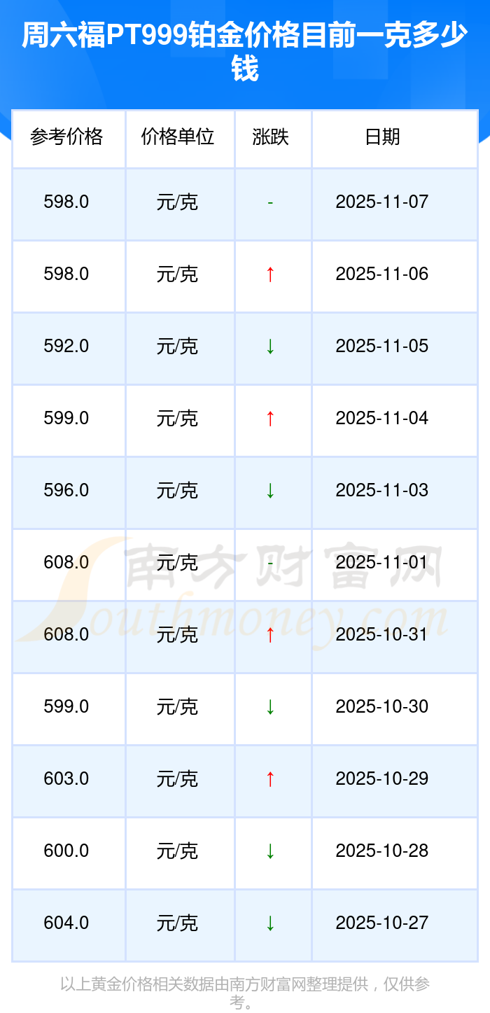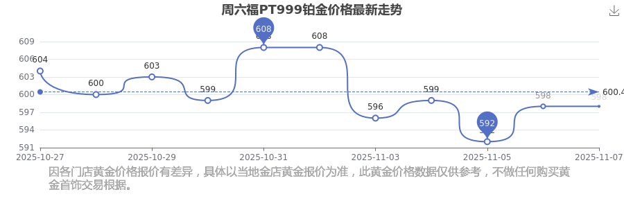 今日(2025年11月9日)周六福PT999鉑金價(jià)格:598.0元/克。