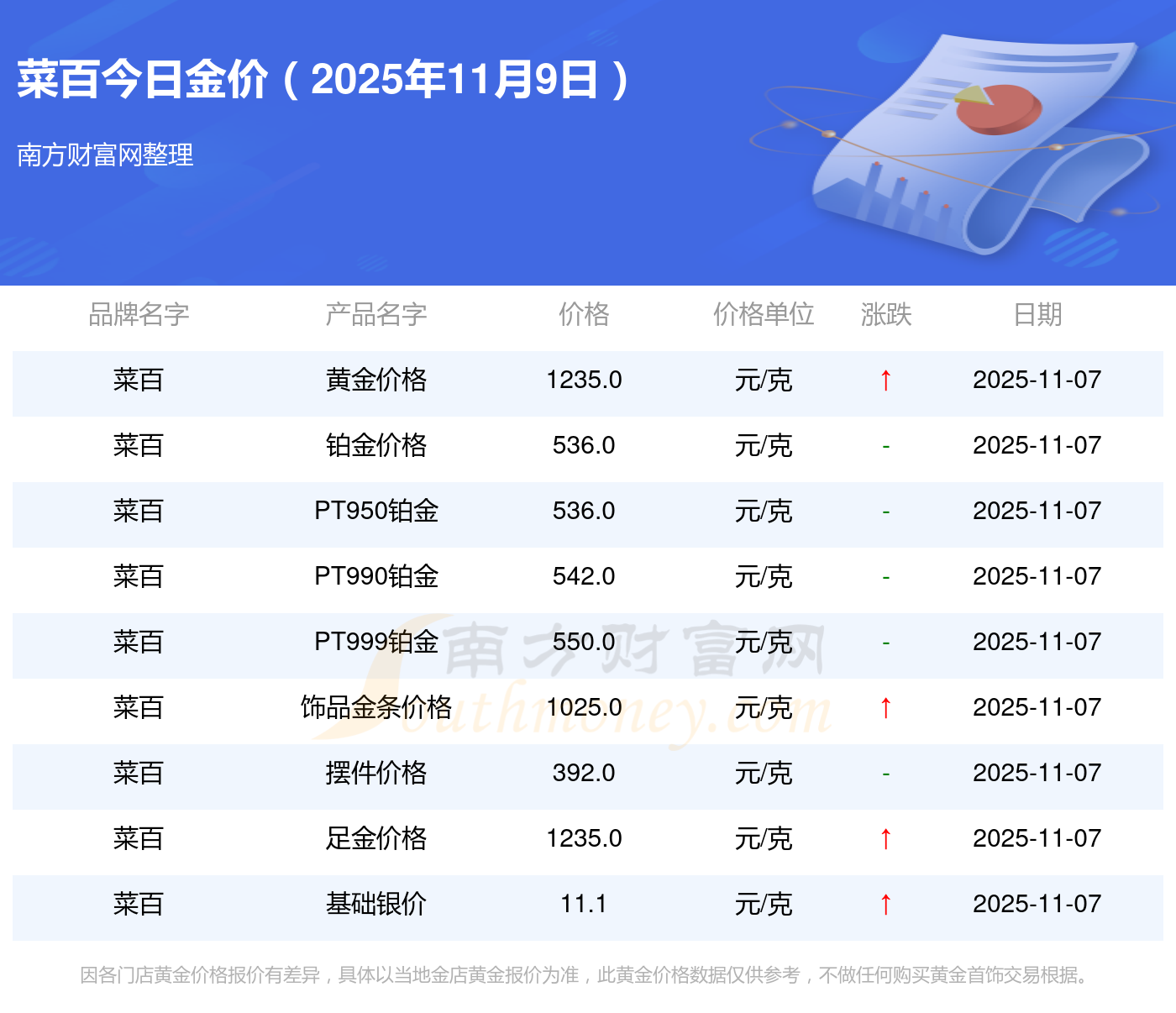 2025年11月9日菜百今日價格:銀條價格11.4元/克,黃金價格1263.0元/克,鉑金價格560.0元/克,金條價格(內(nèi)地)1202.0元/克,金飾價格(內(nèi)地)1268.0元/克,黃金飾品(香港)44260.0,鉑金飾品(香港)13080.0,金條金價(香港)39960.0,投資金條1243.0元/克,工藝金條1258.0元/克,千足金首飾1248.0元/克。