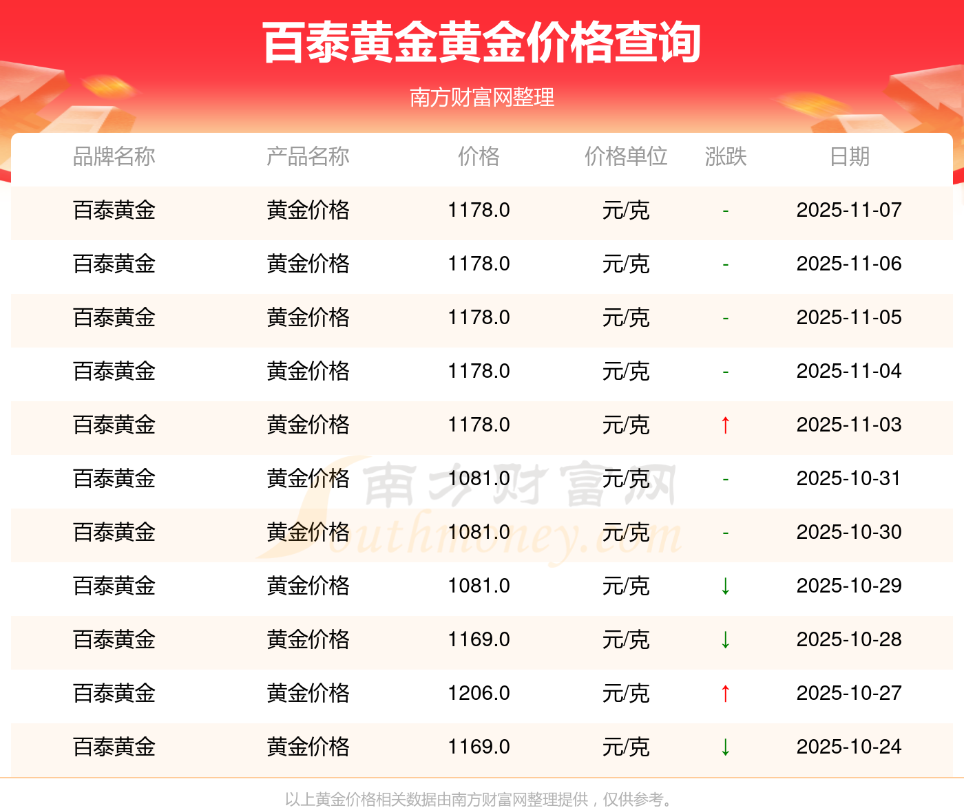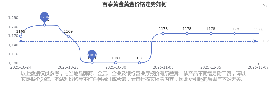 今日黃金售價(jià)是多少呢?此刻每克黃金價(jià)錢(qián)怎樣?黃金每一克的價(jià)位大概是多少呢?百泰黃金 黃金價(jià)格于今日的最新掛牌價(jià)為1178.0元/克。
