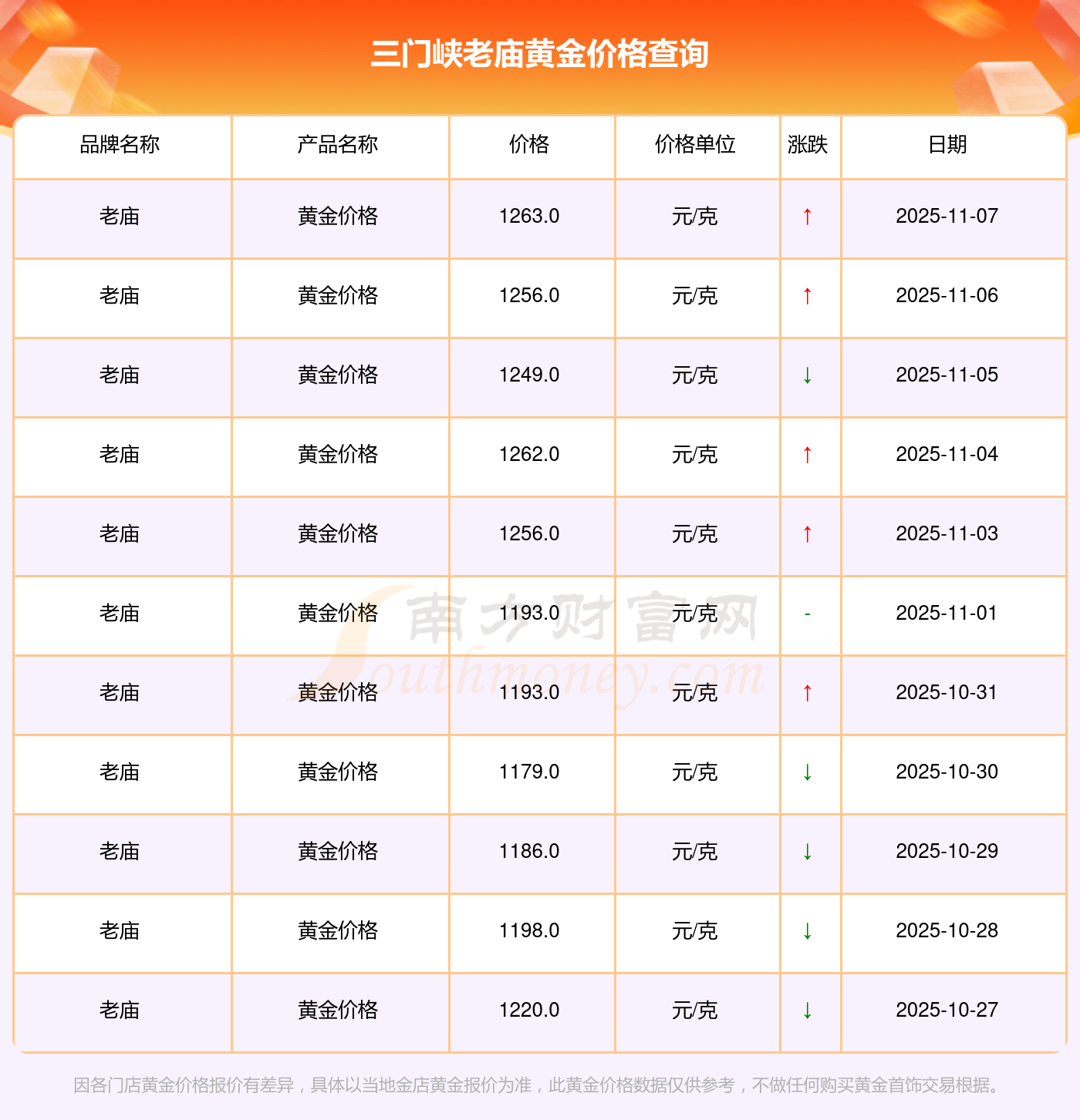 今日(2025年11月9日),三門峽老廟黃金價格的定價為 1263.0元/克。