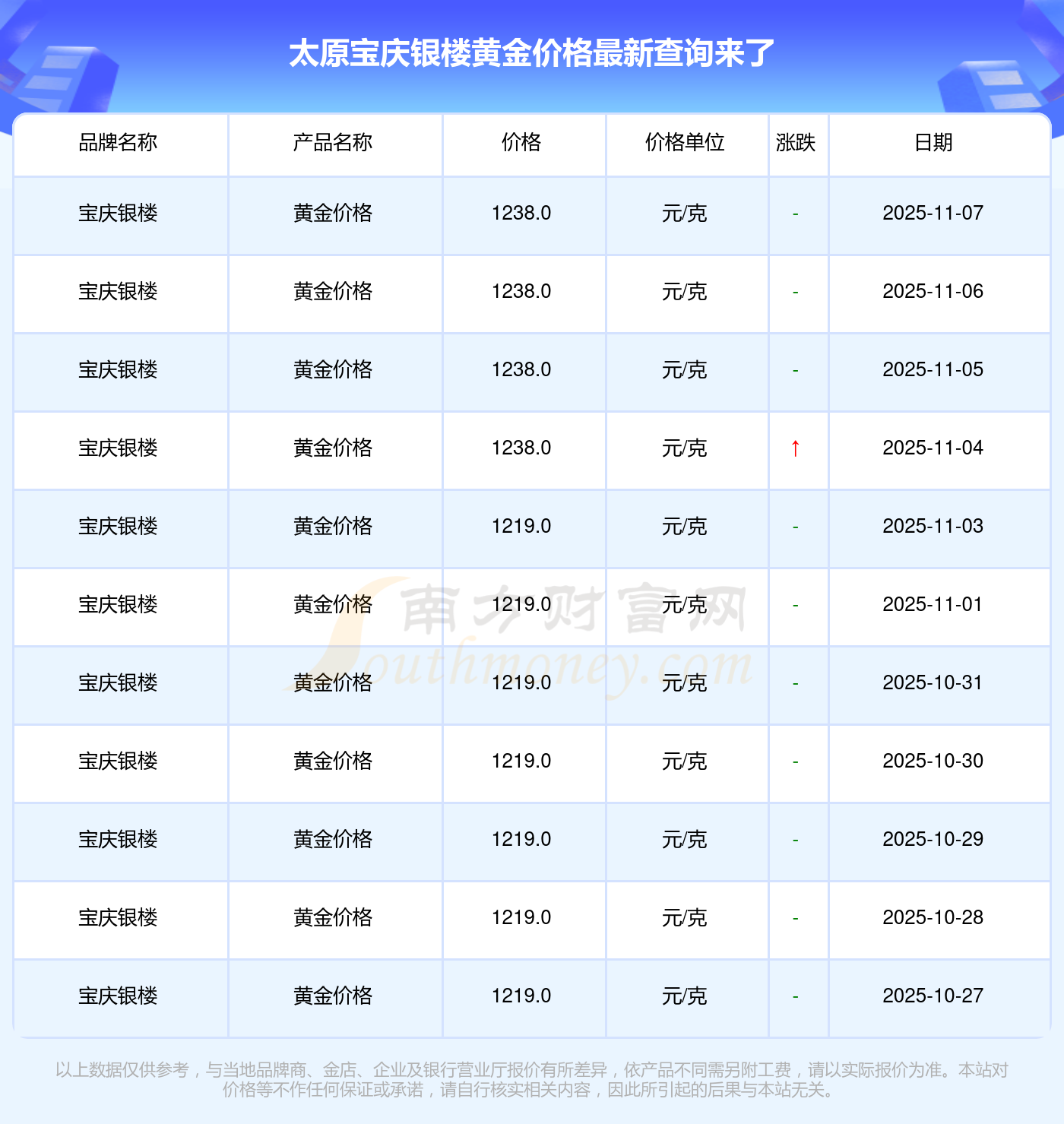 2025年11月9日這一天,太原寶慶銀樓的黃金價(jià)格以 1238.0元/克的價(jià)格售賣(mài)。