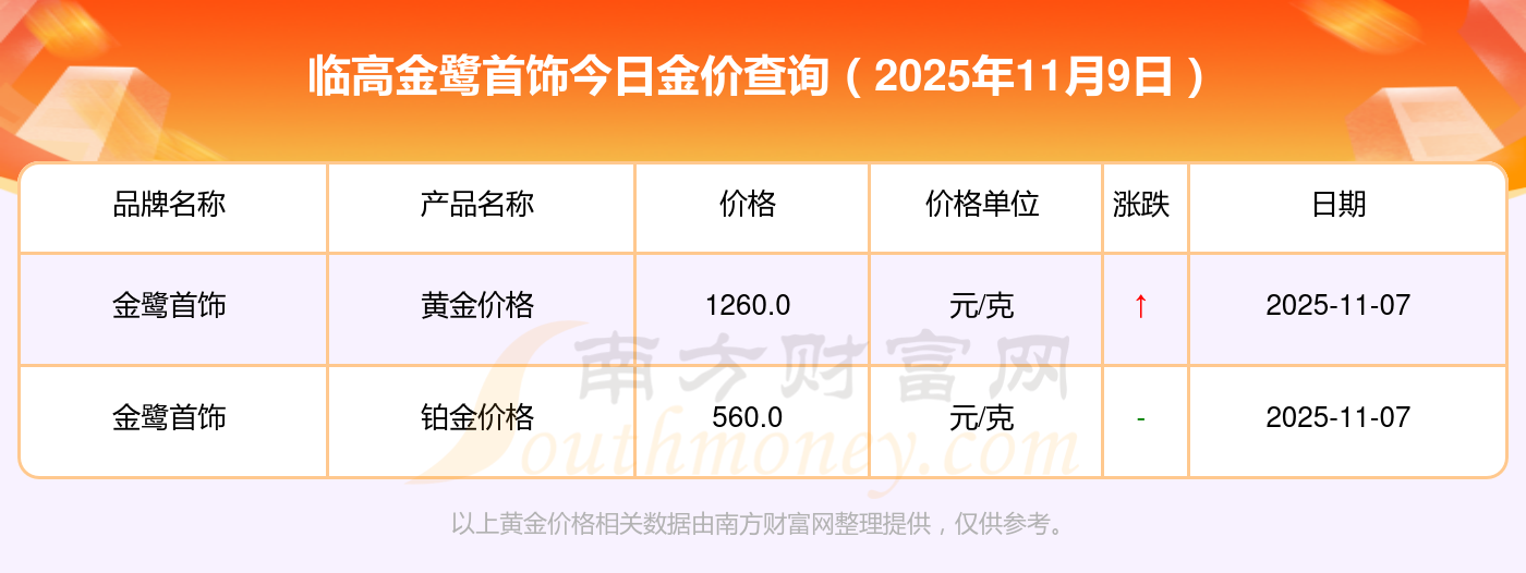今日黃金價(jià)格是怎樣的?當(dāng)下黃金一克要賣多少錢?2025年11月9日臨高金鷺首飾黃金的單價(jià),一克為多少?銀條價(jià)格11.4元/克,黃金價(jià)格1263.0元/克,鉑金價(jià)格560.0元/克,金條價(jià)格(內(nèi)地)1202.0元/克,金飾價(jià)格(內(nèi)地)1268.0元/克,黃金飾品(香港)44260.0,鉑金飾品(香港)13080.0,金條金價(jià)(香港)39960.0,投資金條1243.0元/克,工藝金條1258.0元/克,千足金首飾1248.0元/克。