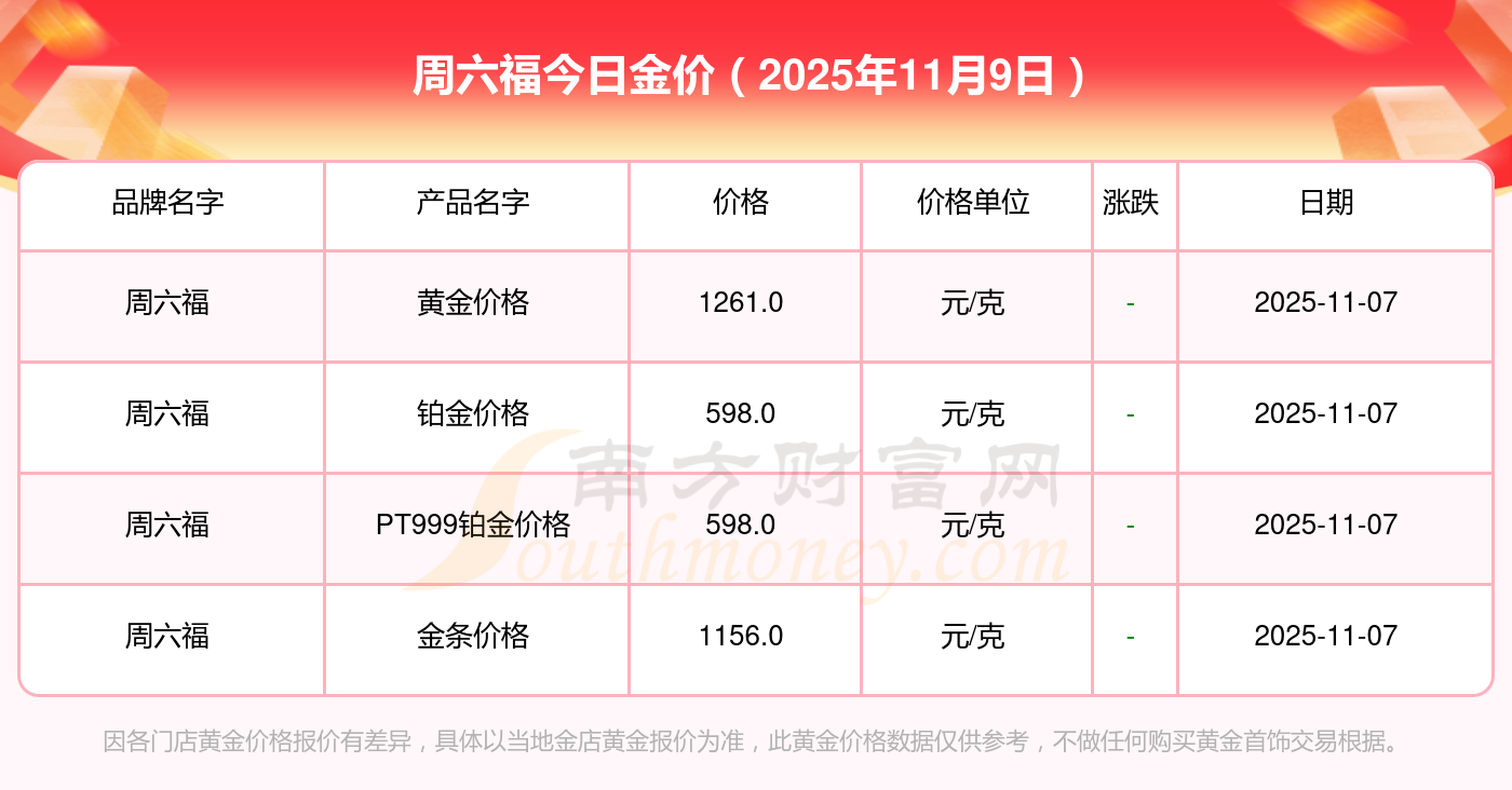 2025年11月9日周六福金價查詢:銀條價格11.4元/克,黃金價格1263.0元/克,鉑金價格560.0元/克,金條價格(內地)1202.0元/克,金飾價格(內地)1268.0元/克,黃金飾品(香港)44260.0,鉑金飾品(香港)13080.0,金條金價(香港)39960.0,投資金條1243.0元/克,工藝金條1258.0元/克,千足金首飾1248.0元/克。