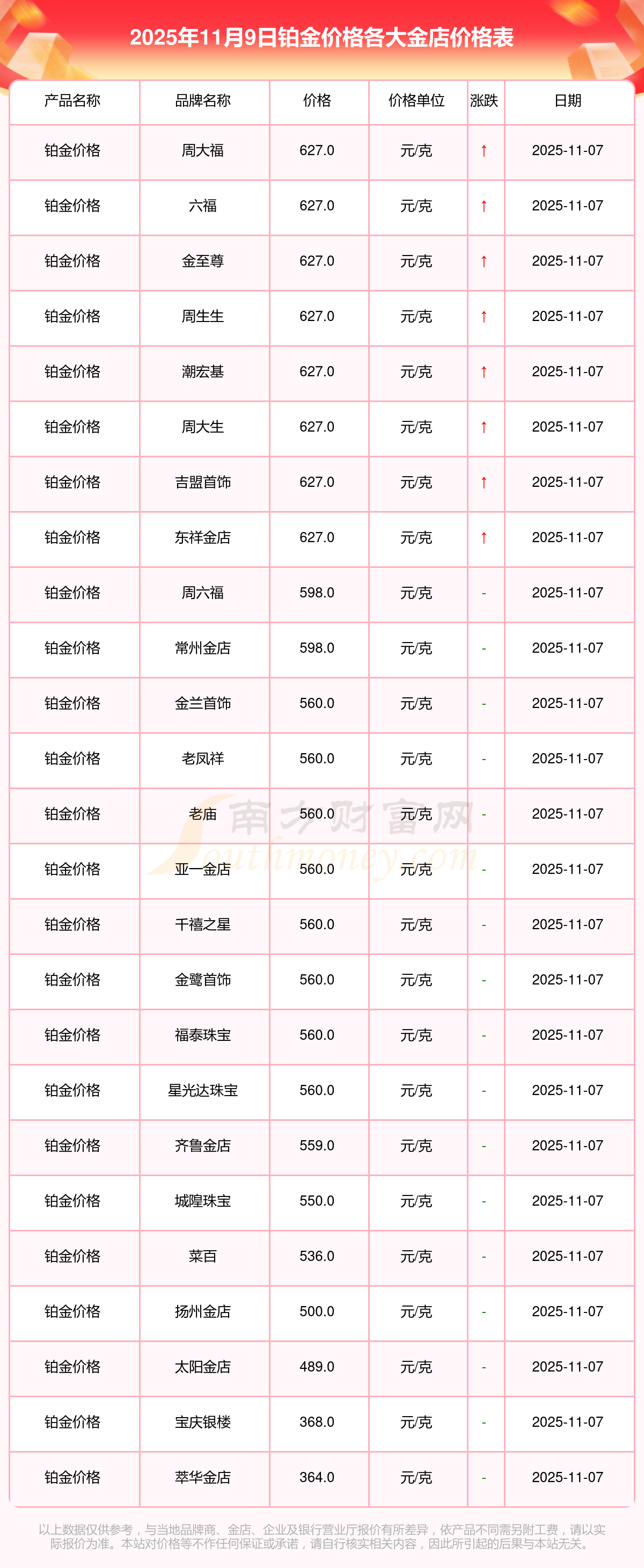 今日鉑金價格報價最高的金店是周大福,為627.0元/克,報價最低的金店是萃華金店,為364.0元/克。今日鉑金價格高低差為263元/克。
