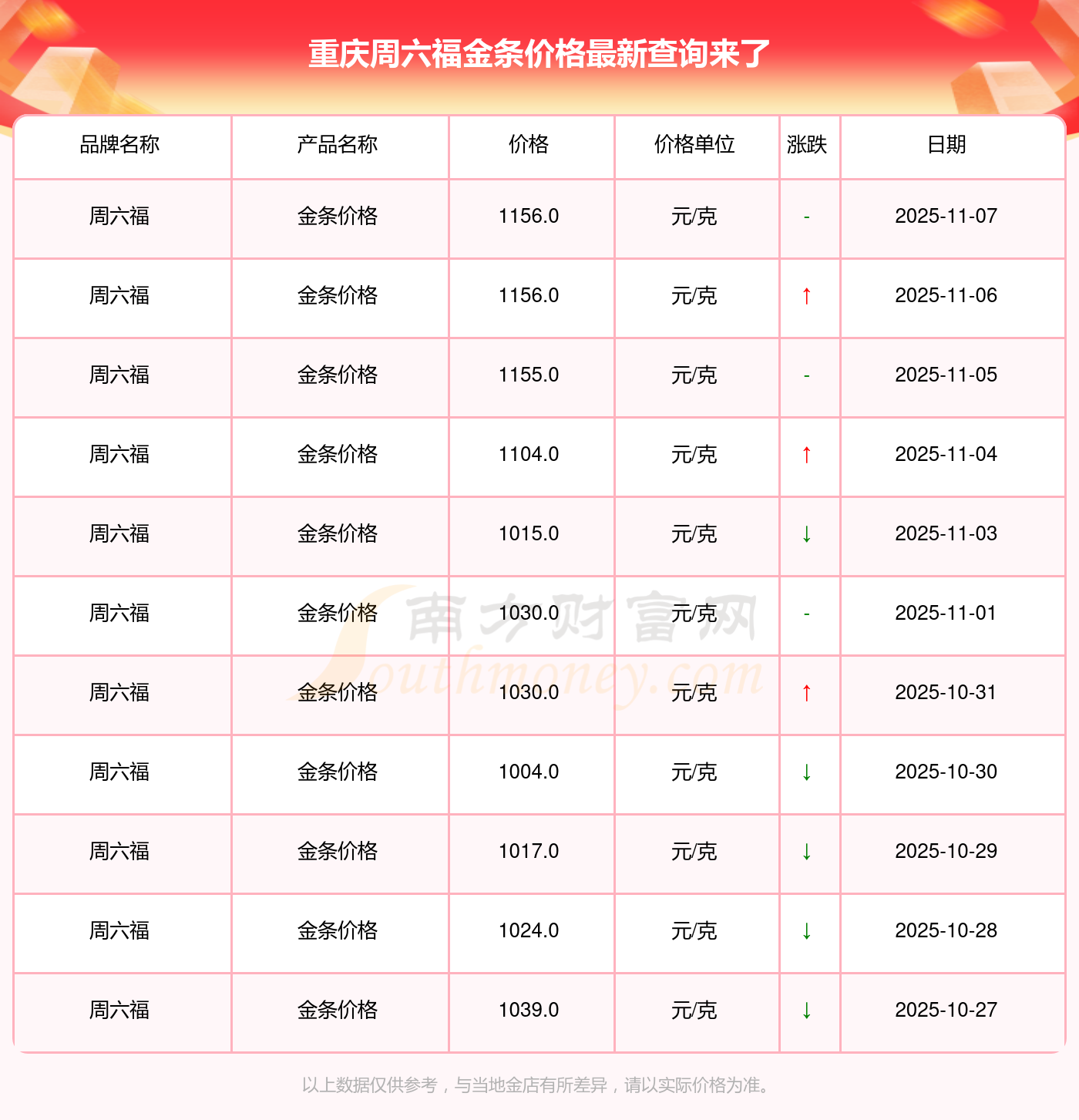 今日(2025年11月9日)重慶周六福金條價(jià)格為1156.0元/克。