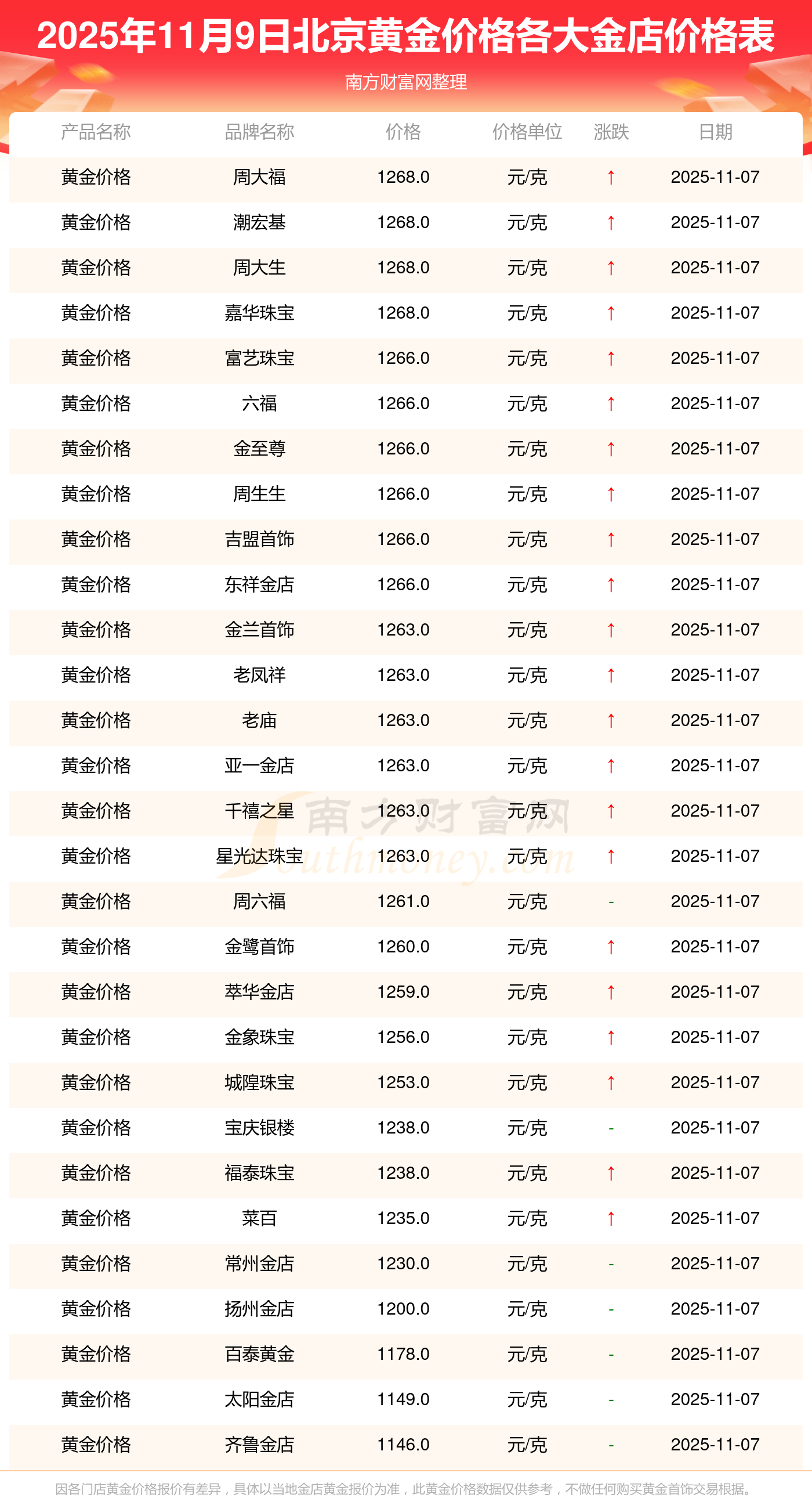 今天是2025年11月9日,北京寶泉錢幣、金蘭首飾、金蘭首飾、謝瑞麟、謝瑞麟、謝瑞麟、謝瑞麟、謝瑞麟、金銀街、金銀街、金銀街等各大金店品牌黃金價(jià)格最新價(jià)格如下:寶泉錢幣11.4元/克、金蘭首飾1263.0元/克、金蘭首飾560.0元/克、謝瑞麟1202.0元/克、謝瑞麟1268.0元/克、謝瑞麟44260.0、謝瑞麟13080.0、謝瑞麟39960.0、金銀街1243.0元/克、金銀街1258.0元/克、金銀街1248.0元/克。