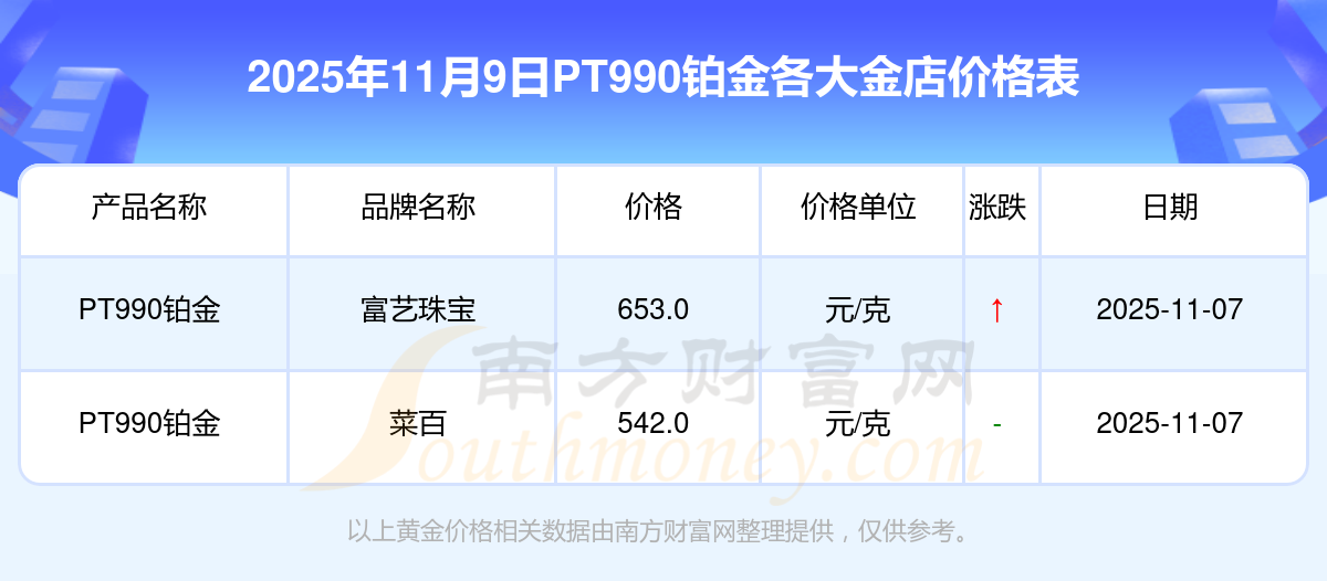 今日PT990鉑金最高的金店是富藝珠寶,報(bào)價(jià)653.0元/克,PT990鉑金最低的金店是菜百,報(bào)價(jià)542.0元/克。今日PT990鉑金高低差為111元/克。