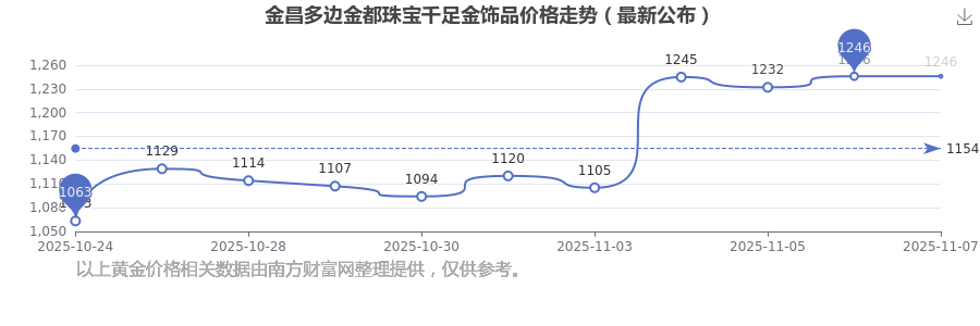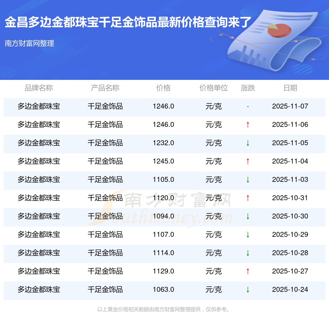今日金昌多邊金都珠寶千足金飾品價格:1246.0元/克。