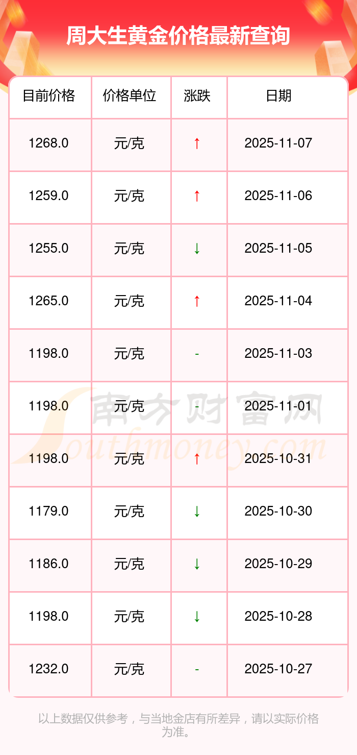 想查詢今天黃金價(jià)格,此刻黃金一克的價(jià)格是多少呀?黃金每一克的價(jià)格大概是多少?今日周大生 黃金價(jià)格,最新確定為1268.0元/克。