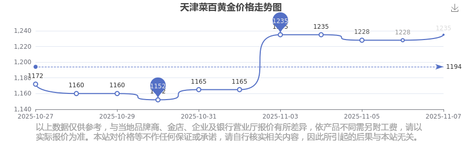 天津菜百在 2025年11月9日的黃金價(jià)格零售價(jià)格為 1235.0元/克。