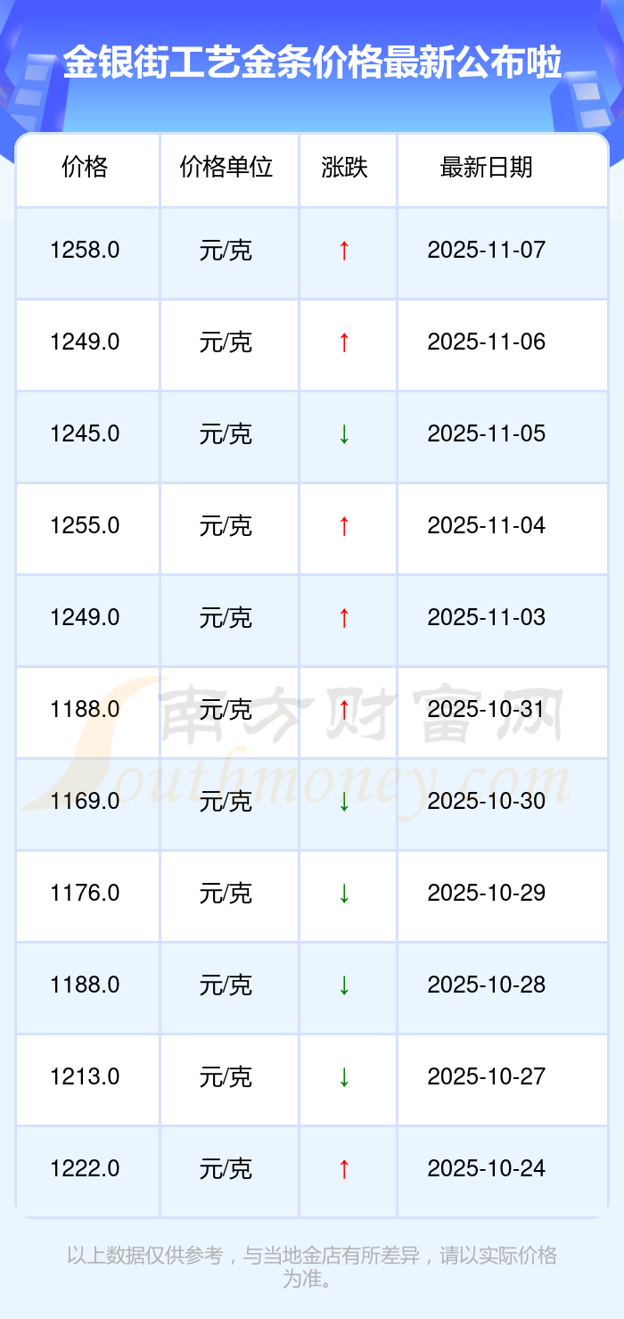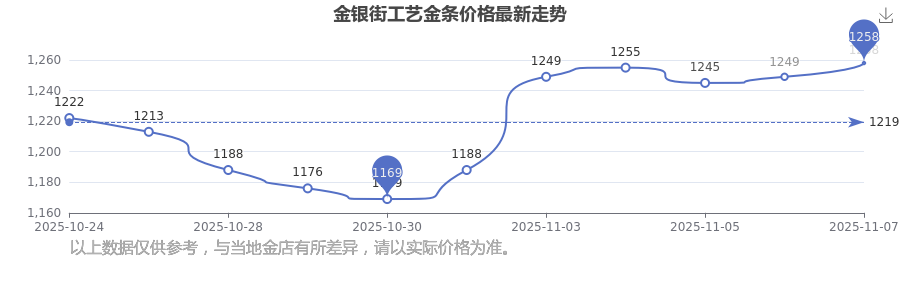 2025年11月9日金銀街工藝金條價(jià)格最新是1258.0元/克。