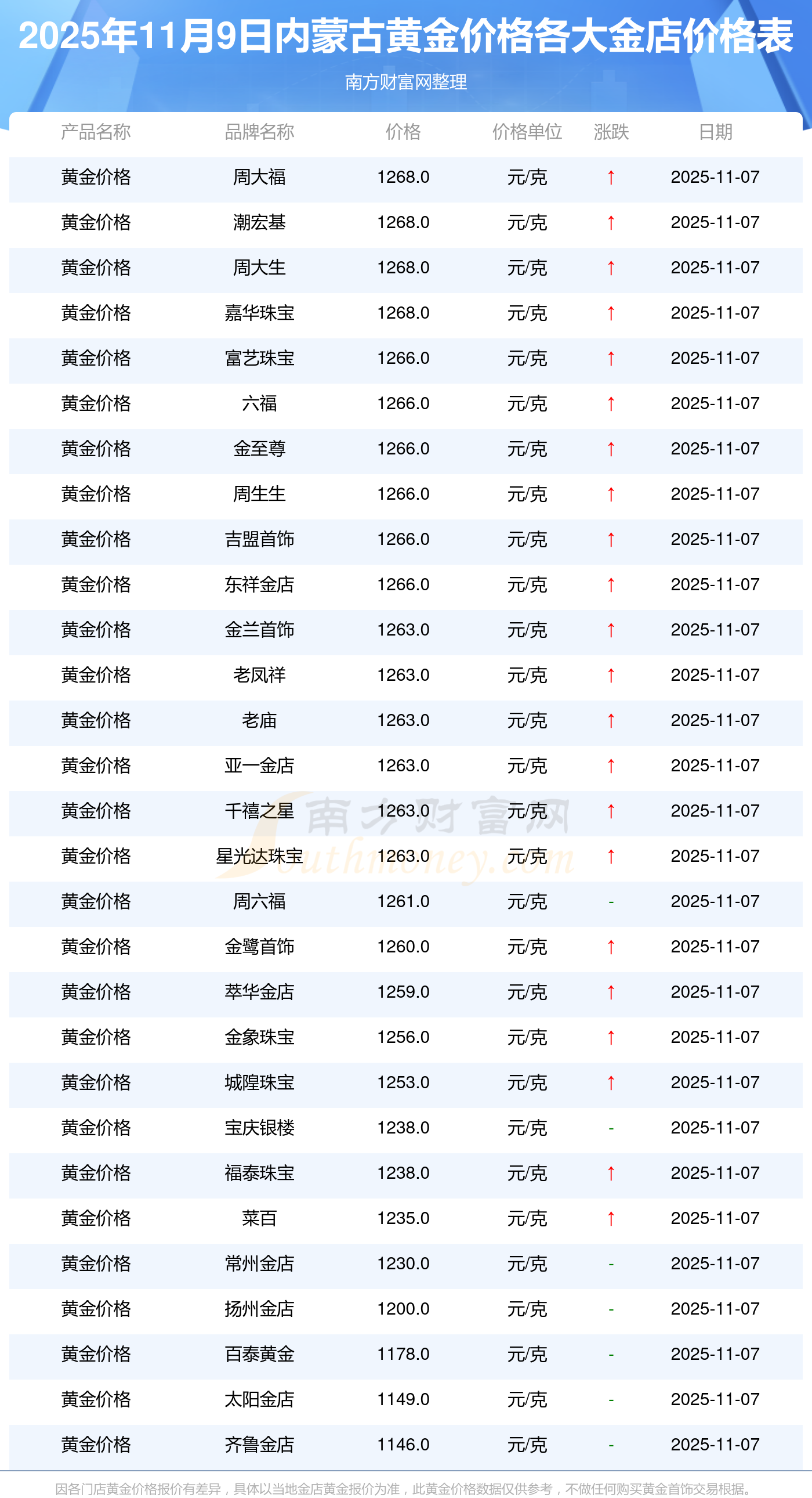 2025年11月9日,內(nèi)蒙古寶泉錢幣、金蘭首飾、金蘭首飾、謝瑞麟、謝瑞麟、謝瑞麟、謝瑞麟、謝瑞麟、金銀街、金銀街、金銀街等各大金店品牌黃金價格今日價格行情最新來了:寶泉錢幣11.4元/克、金蘭首飾1263.0元/克、金蘭首飾560.0元/克、謝瑞麟1202.0元/克、謝瑞麟1268.0元/克、謝瑞麟44260.0、謝瑞麟13080.0、謝瑞麟39960.0、金銀街1243.0元/克、金銀街1258.0元/克、金銀街1248.0元/克。