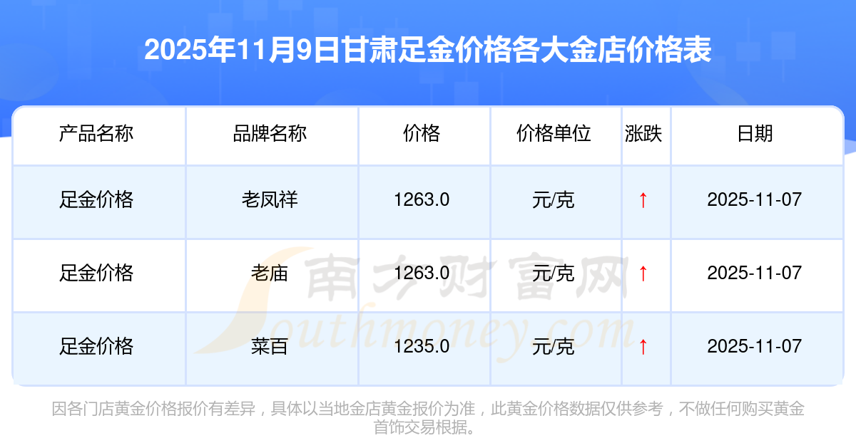 2025年11月9日甘肅各大金店足金價(jià)格最新價(jià)格查詢來(lái)了:寶泉錢(qián)幣11.4元/克,金蘭首飾1263.0元/克,金蘭首飾560.0元/克,謝瑞麟1202.0元/克,謝瑞麟1268.0元/克,謝瑞麟44260.0,謝瑞麟13080.0,謝瑞麟39960.0,金銀街1243.0元/克,金銀街1258.0元/克,金銀街1248.0元/克。