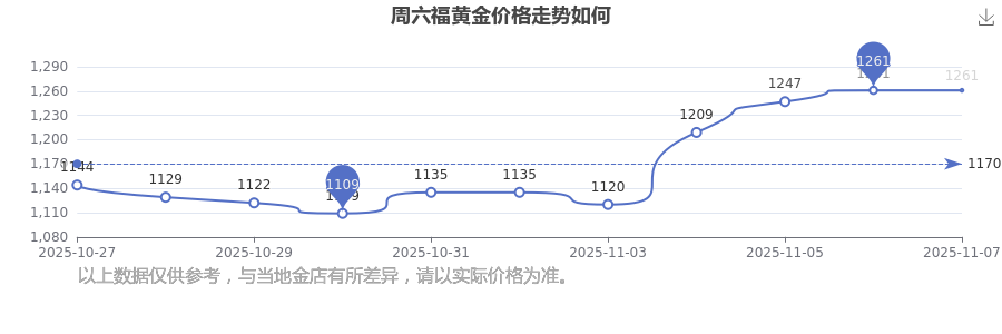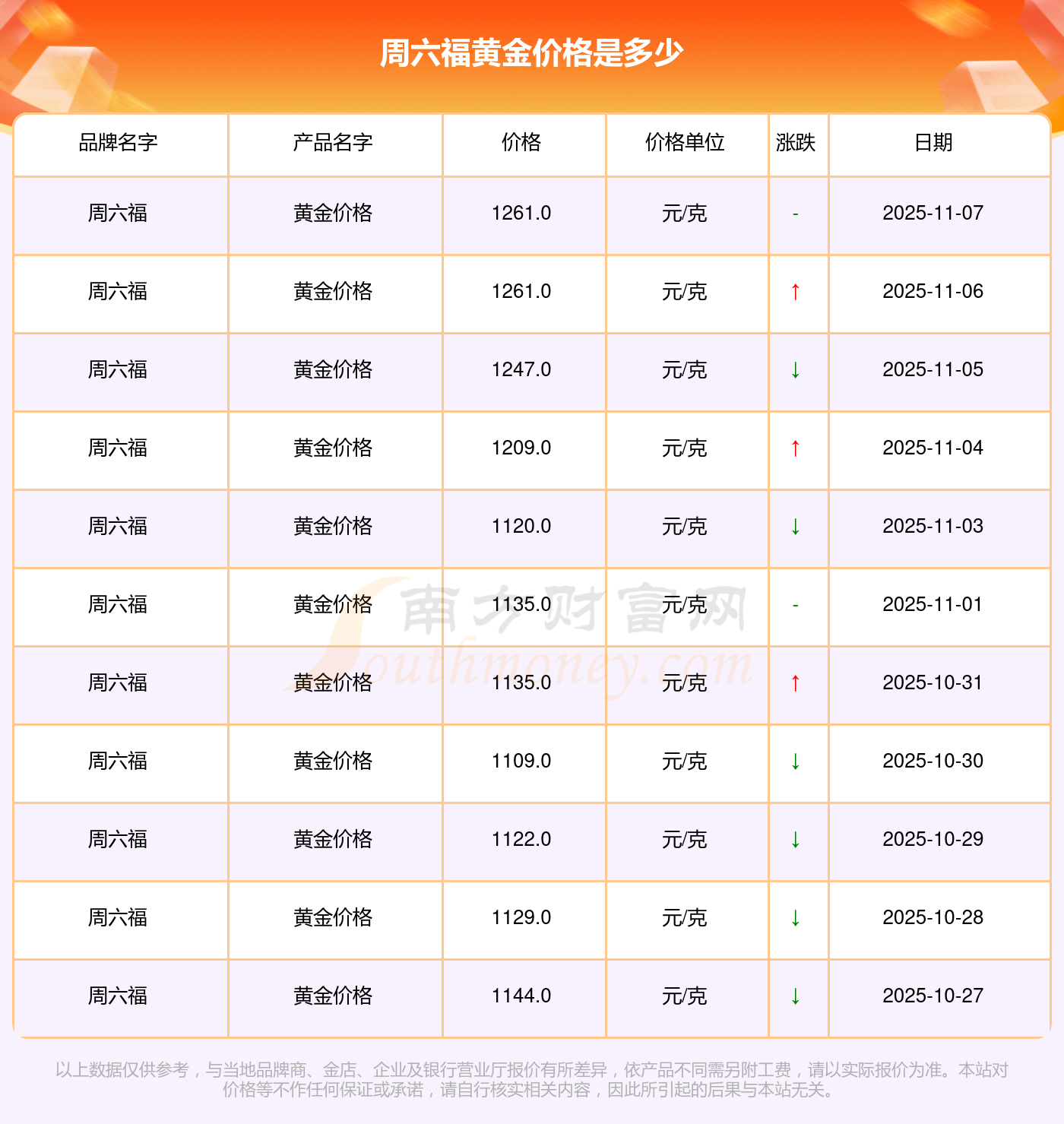 想查詢今天黃金價格,此刻黃金一克的價格是多少呀?黃金價格一般是多少錢一克?今日周六福黃金價格最新價格為1261.0元/克。