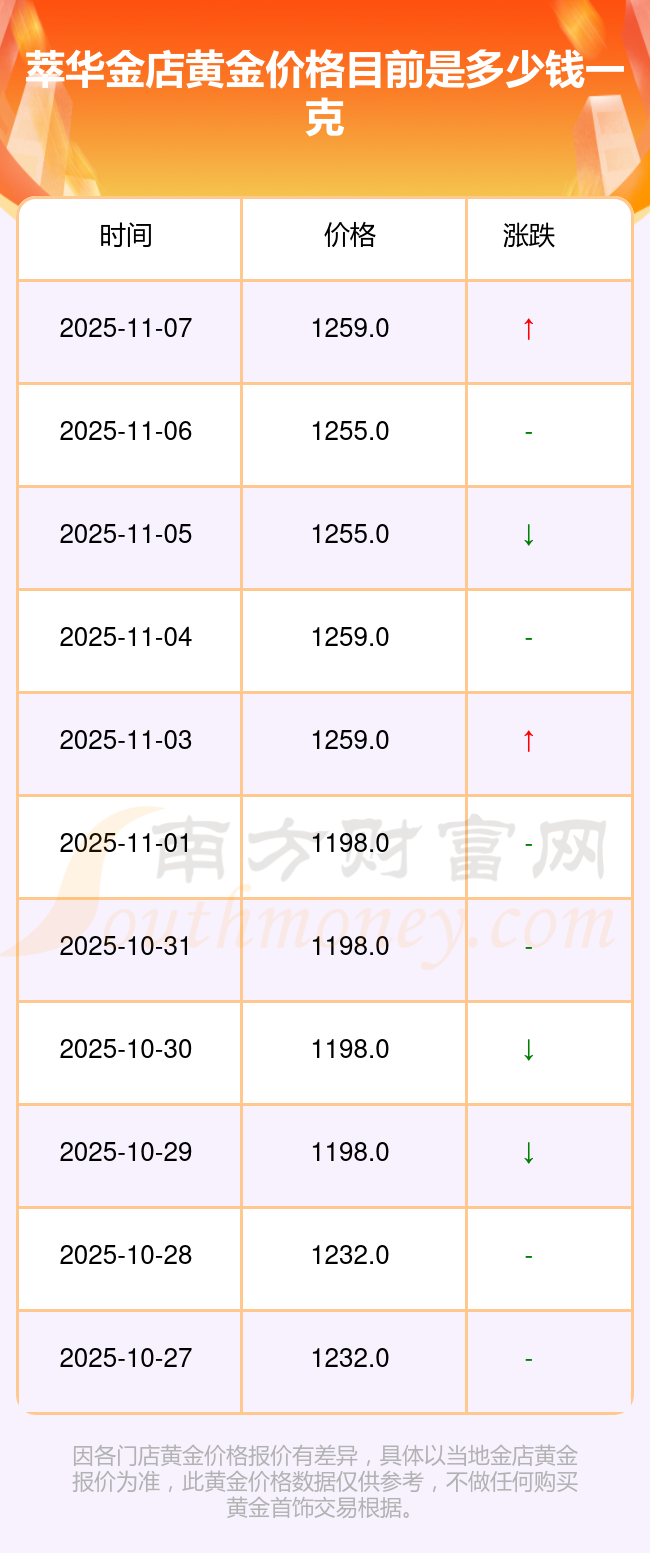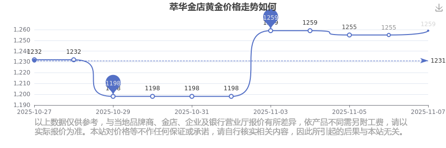 今天黃金價格行情怎樣?此刻每克黃金售價多少?黃金每一克的價格通常來說是多少?今日萃華金店黃金價格最新價格為1259.0元/克。