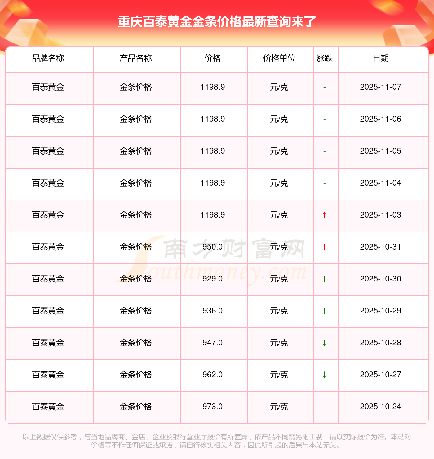 2025年11月9日,重慶百泰黃金的金條價格標價達到 1198.9元/克。