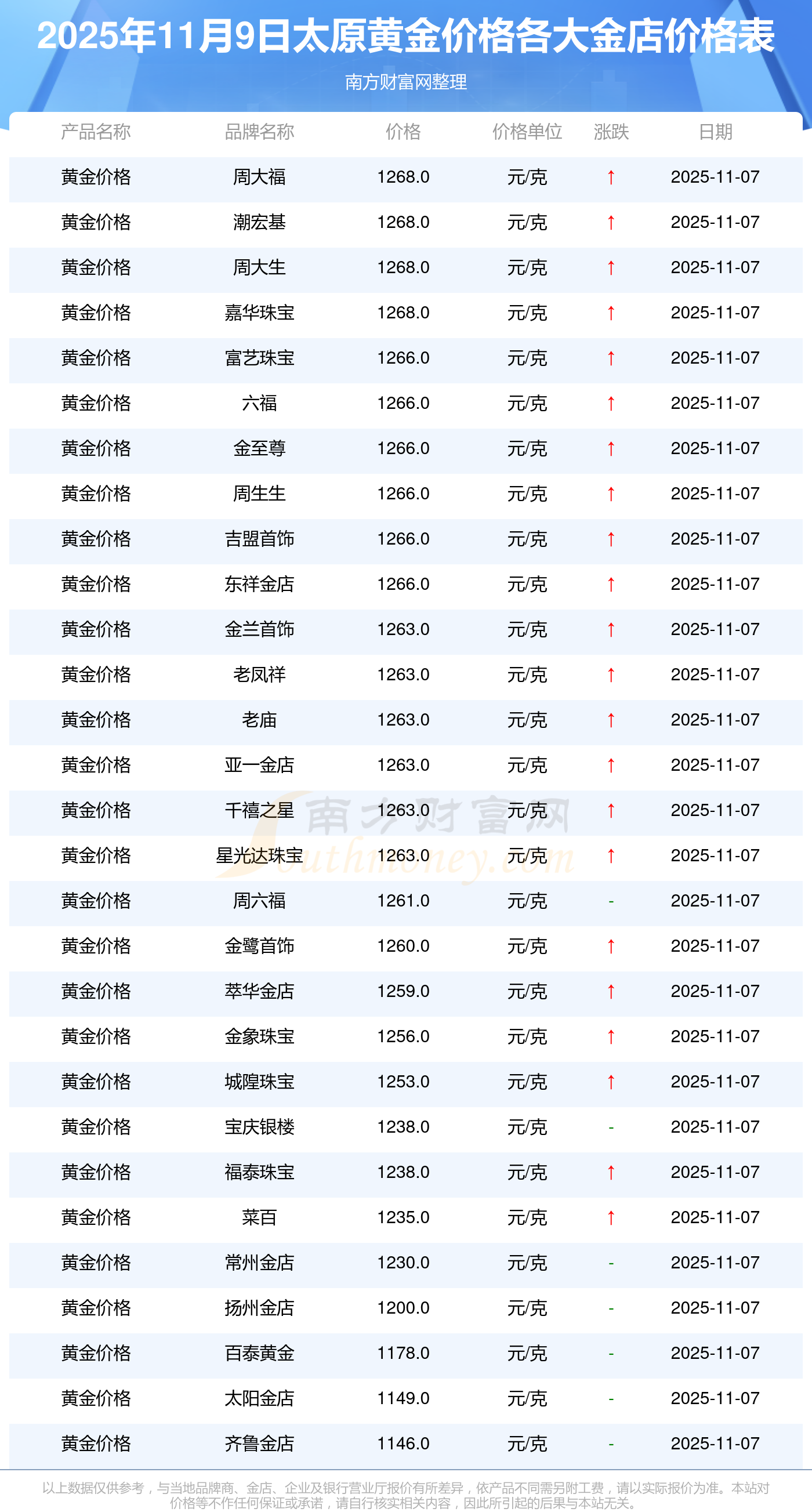 今天是2025年11月9日,太原寶泉錢幣、金蘭首飾、金蘭首飾、謝瑞麟、謝瑞麟、謝瑞麟、謝瑞麟、謝瑞麟、金銀街、金銀街、金銀街等各大金店品牌黃金價(jià)格最新價(jià)格行情是這樣的:寶泉錢幣11.4元/克、金蘭首飾1263.0元/克、金蘭首飾560.0元/克、謝瑞麟1202.0元/克、謝瑞麟1268.0元/克、謝瑞麟44260.0、謝瑞麟13080.0、謝瑞麟39960.0、金銀街1243.0元/克、金銀街1258.0元/克、金銀街1248.0元/克。